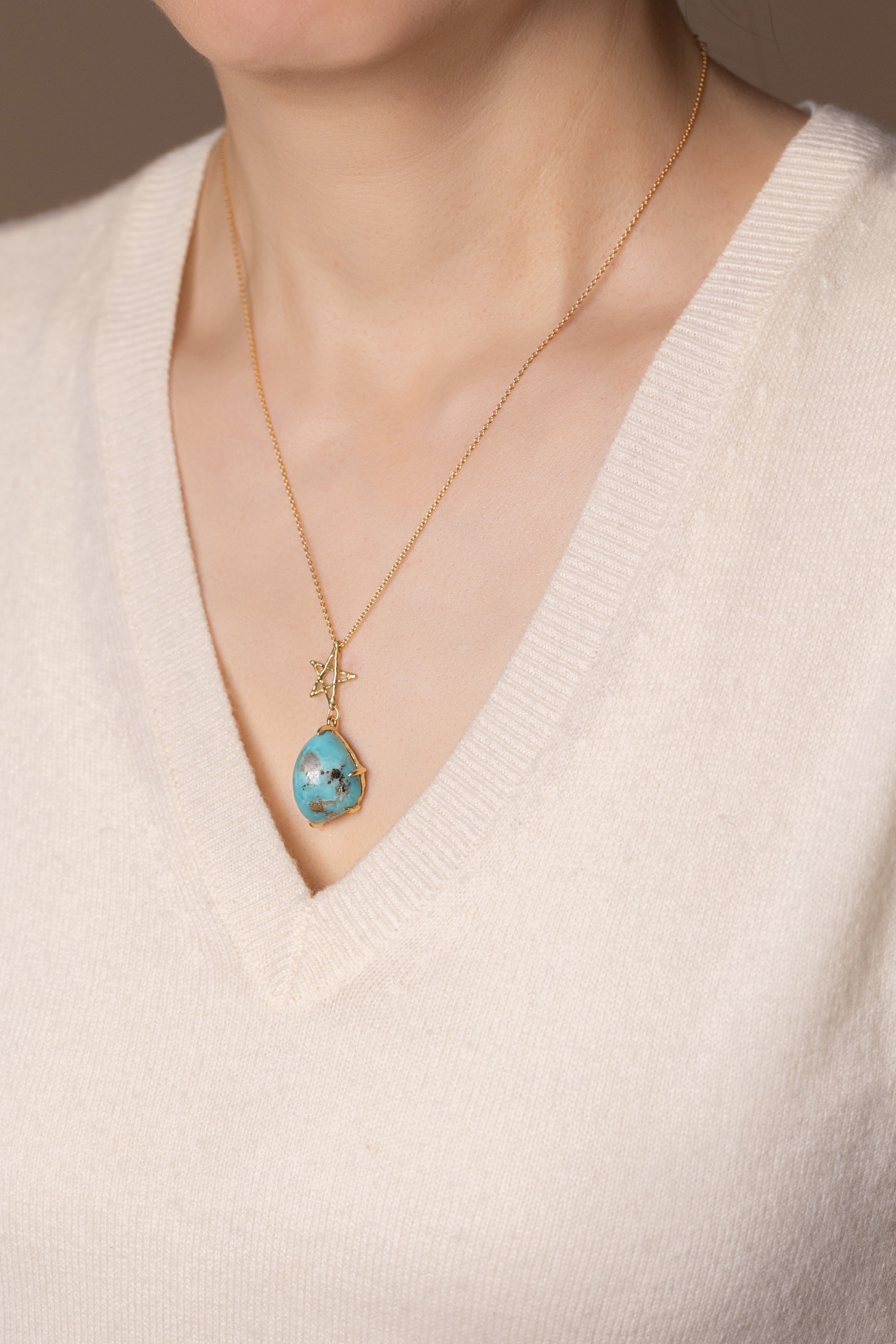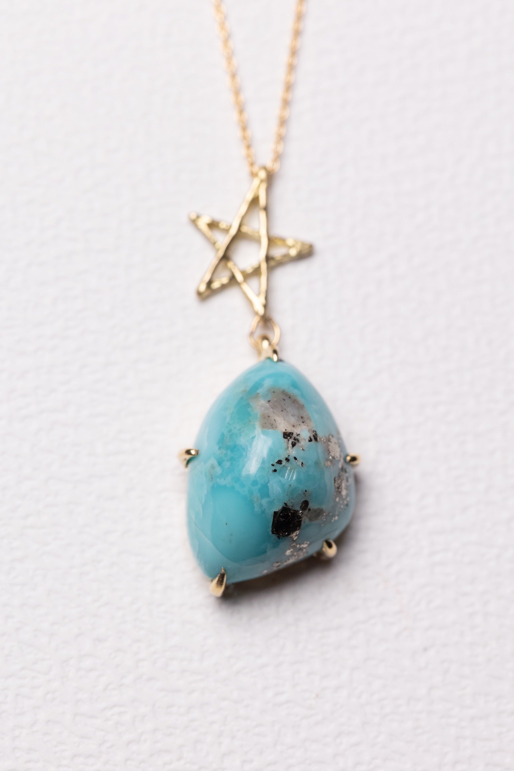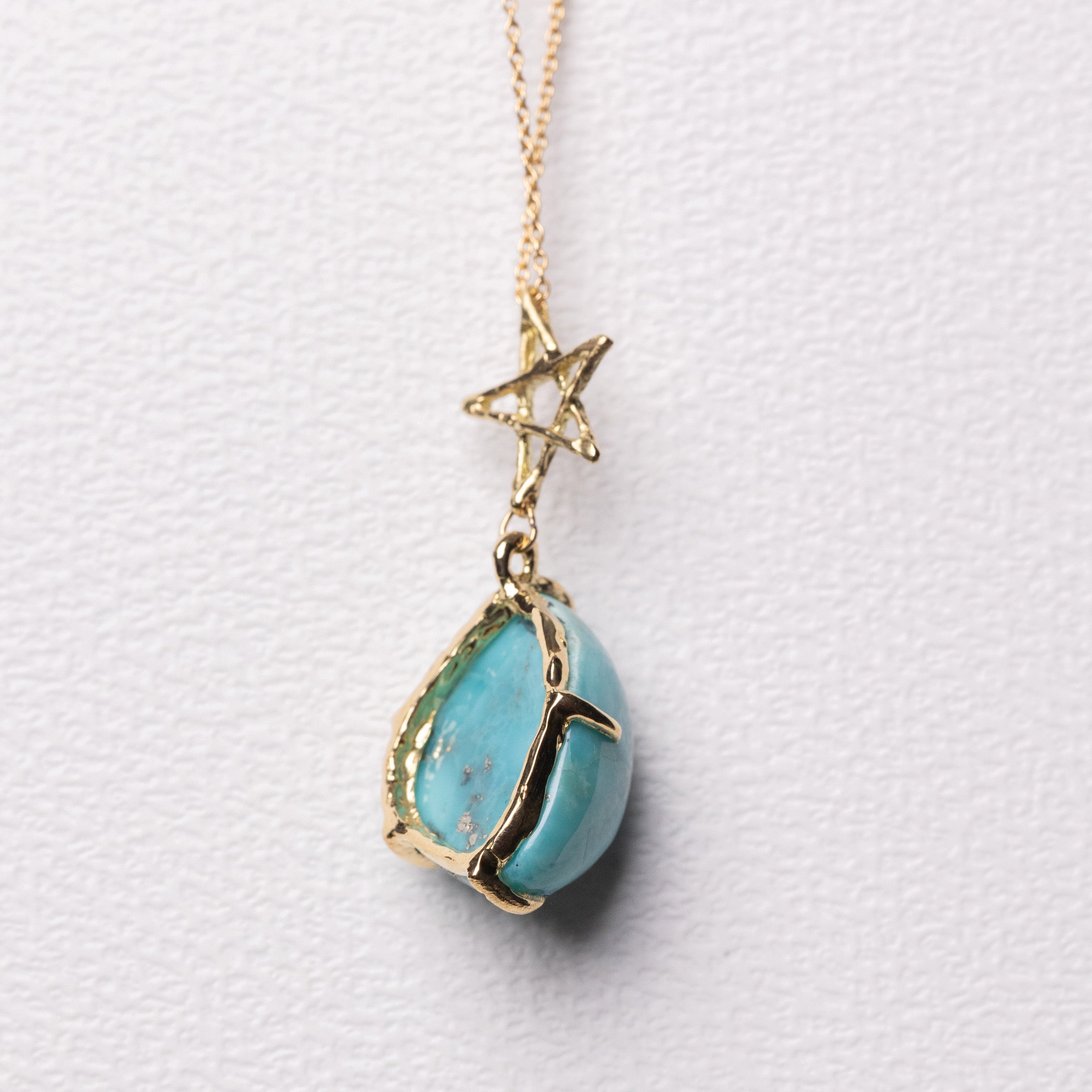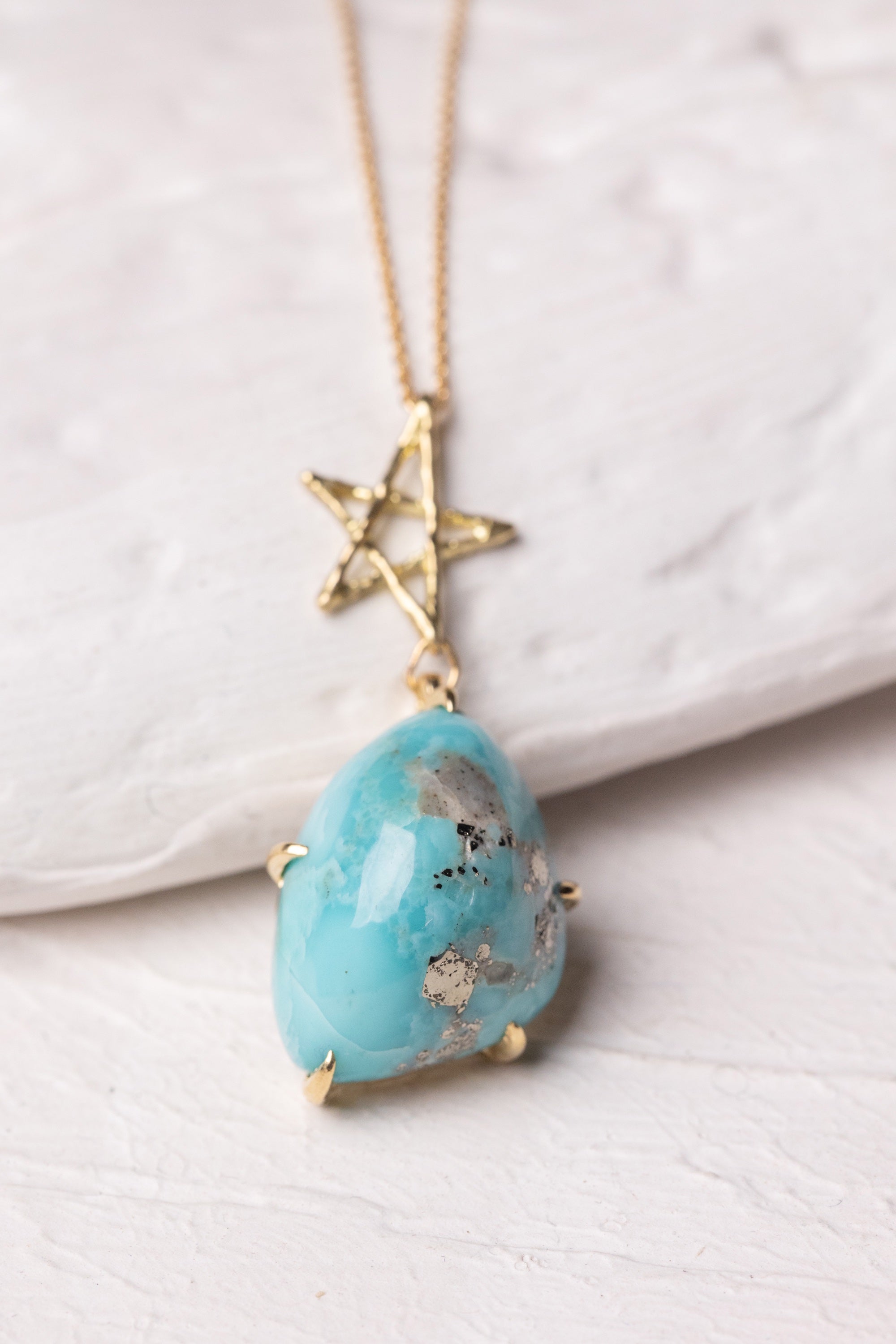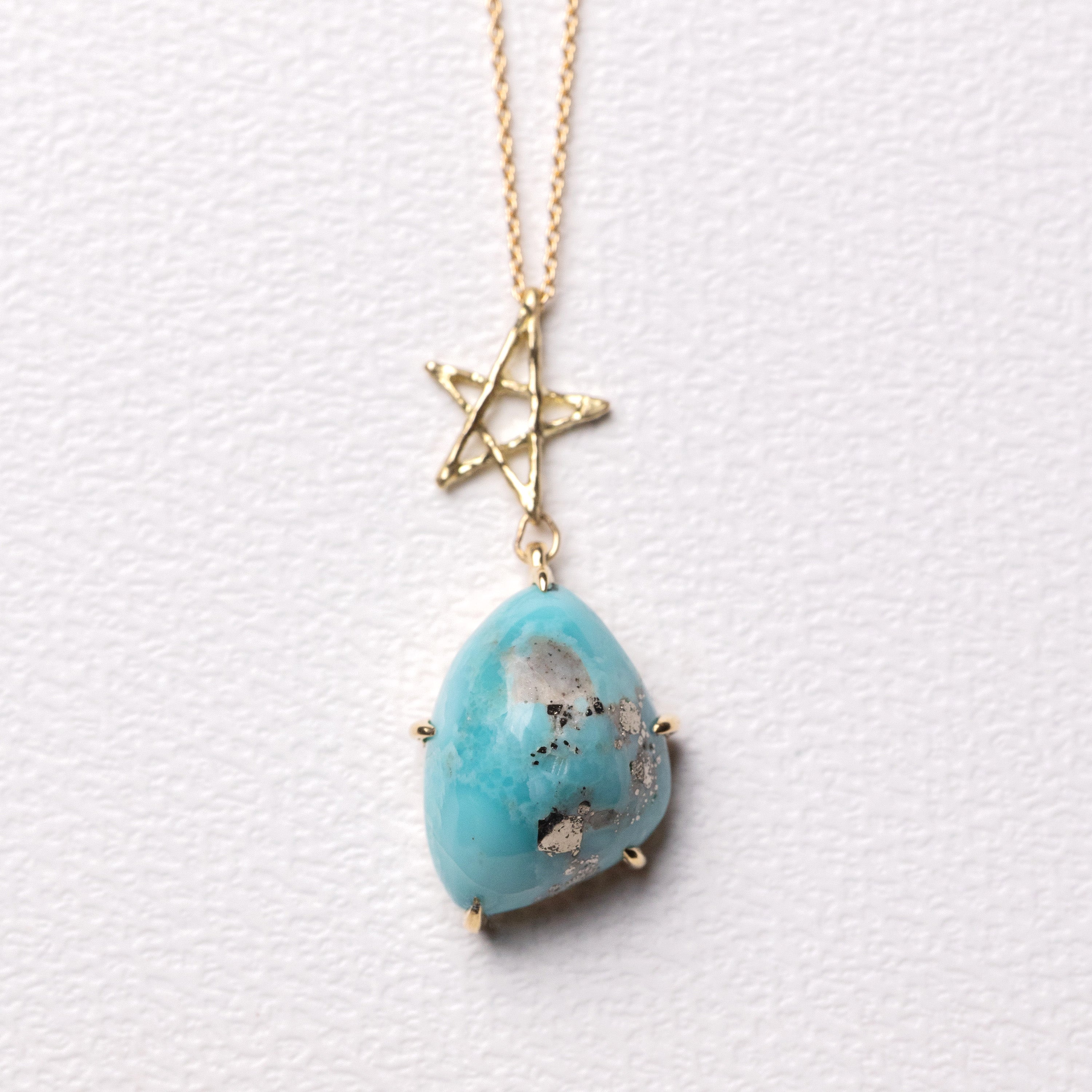 A necklace featuring a smooth pyrite turquoise suspended from an organically textured star