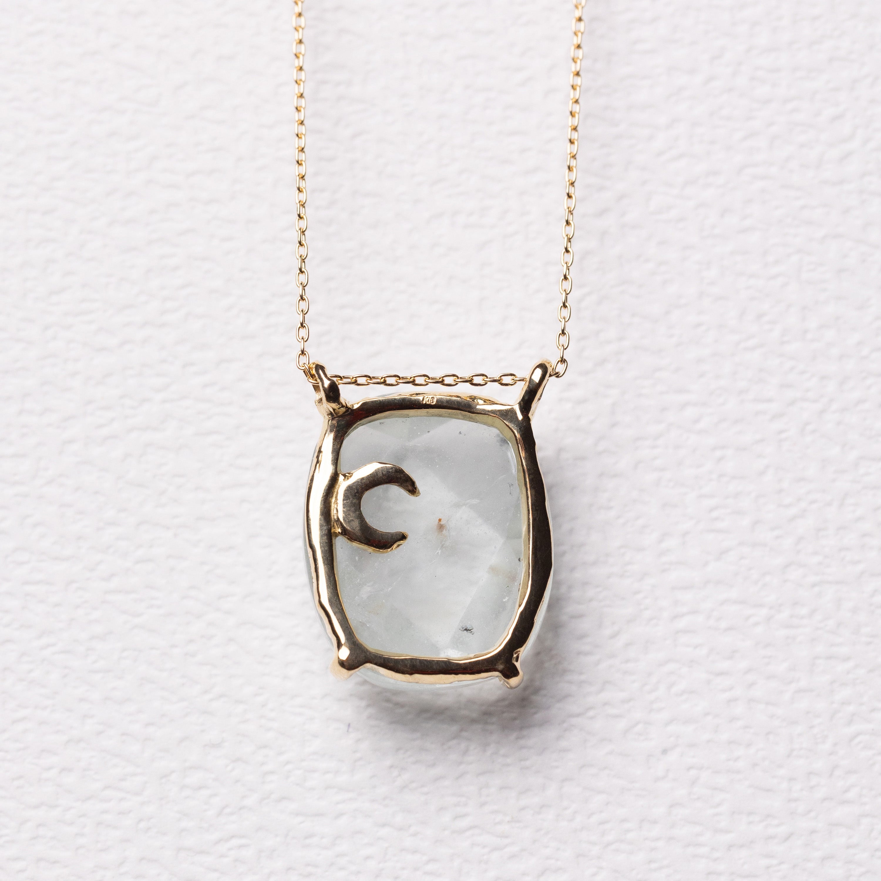 On the back of the topaz rests a crescent moon in 18k, hidden and thoughtful. It brings to mind the feeling of looking up from within water and noticing the moon still lingering in the daytime sky — subtle, calm, and deeply reassuring. With movement, the crescent disappears into the stone, as though absorbed by the crystal itself.