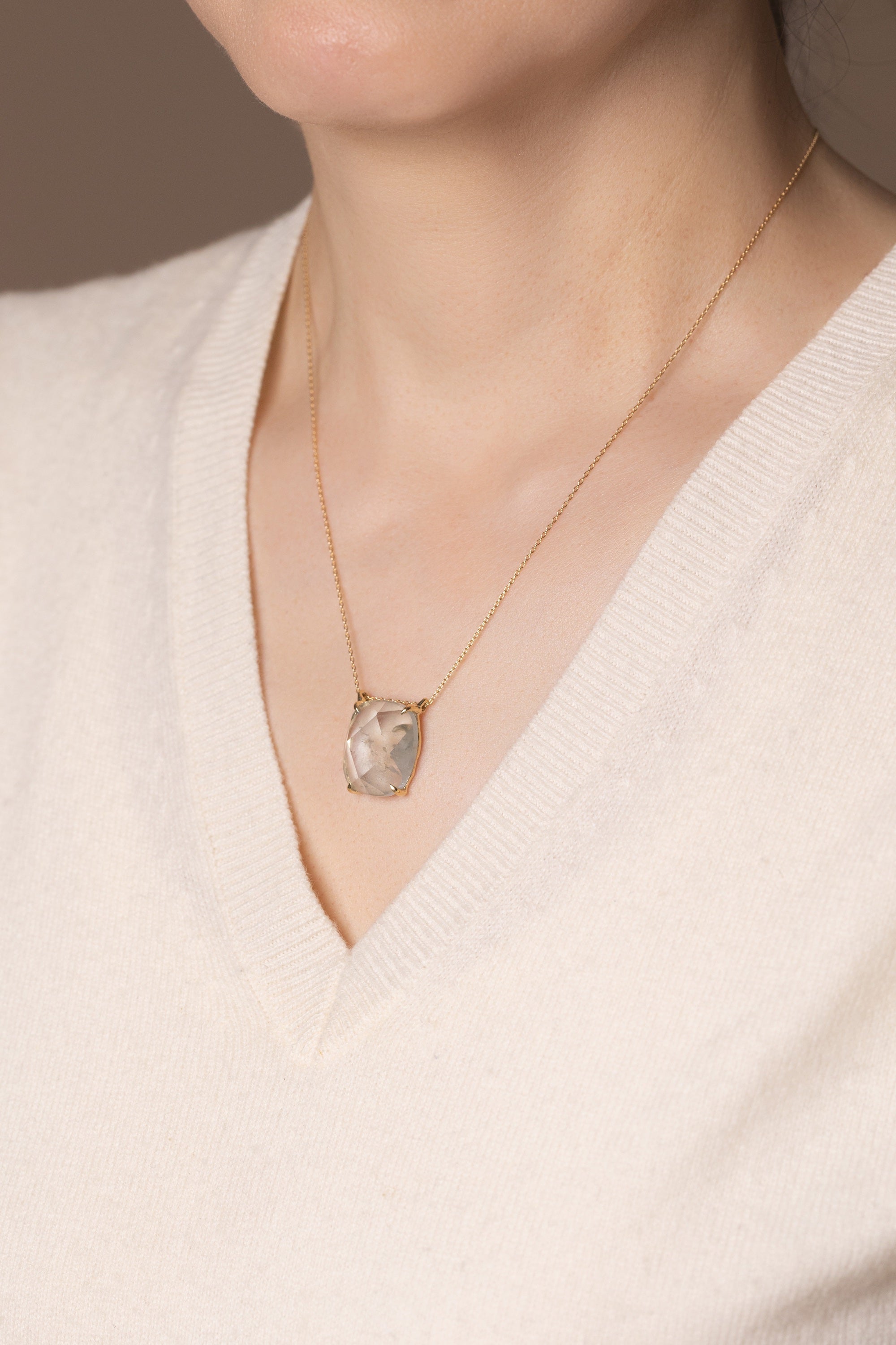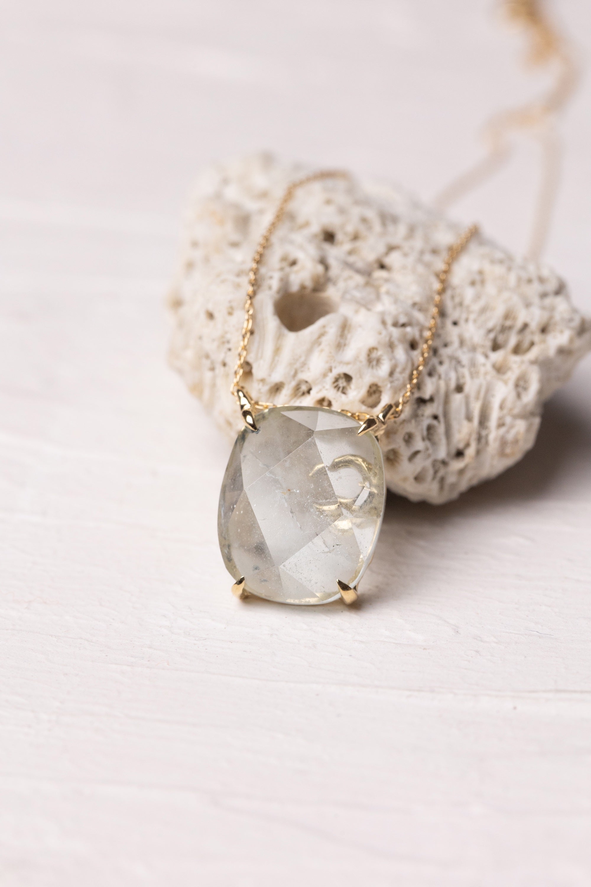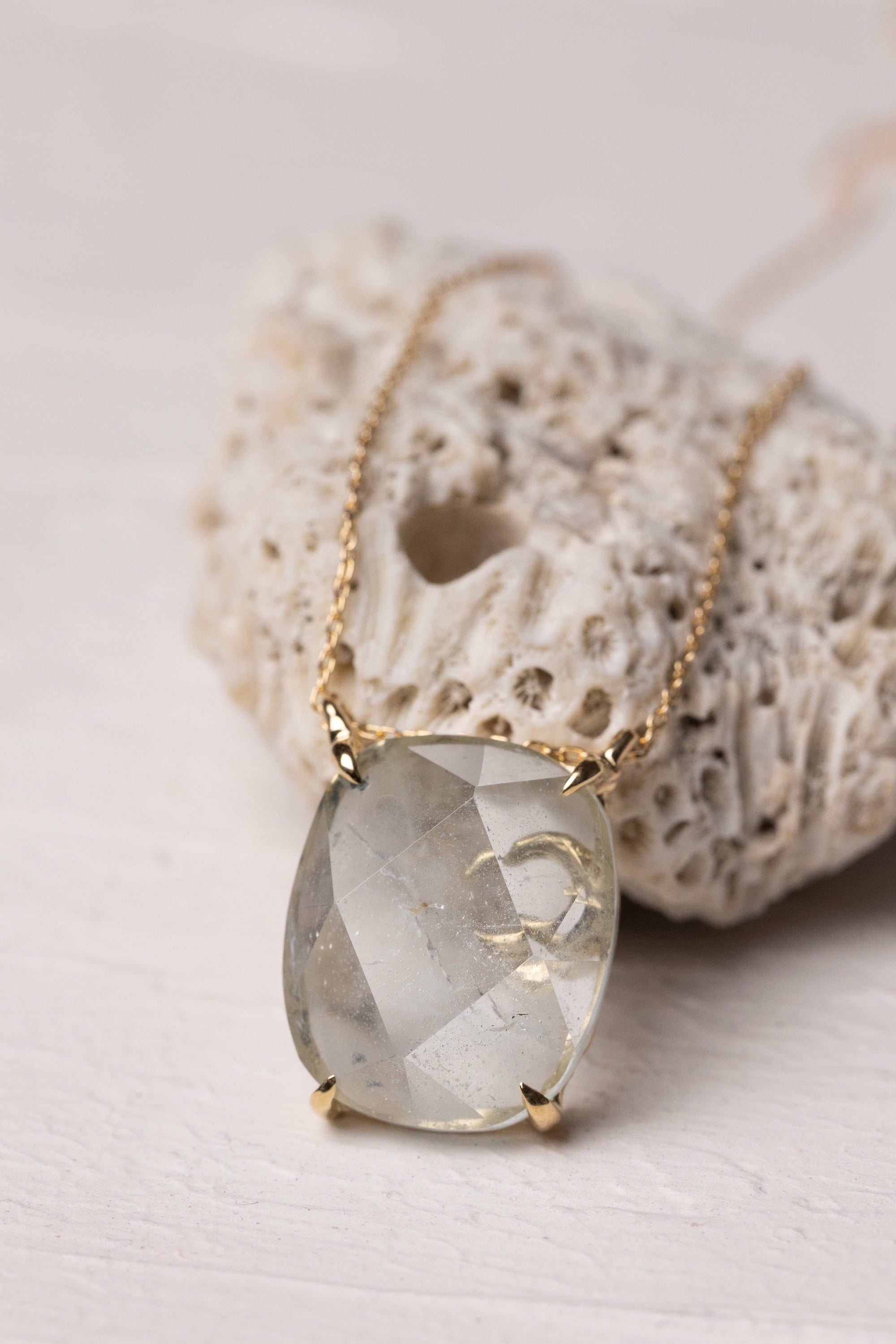 The topaz at the heart of this necklace carries a beautifully ephemeral color, revealed through its larger facets in a gentle, mellow way. As light moves across the surface, the stone seems to shift and soften, sometimes glowing clearly, other times fading almost completely into its own crystal formation.