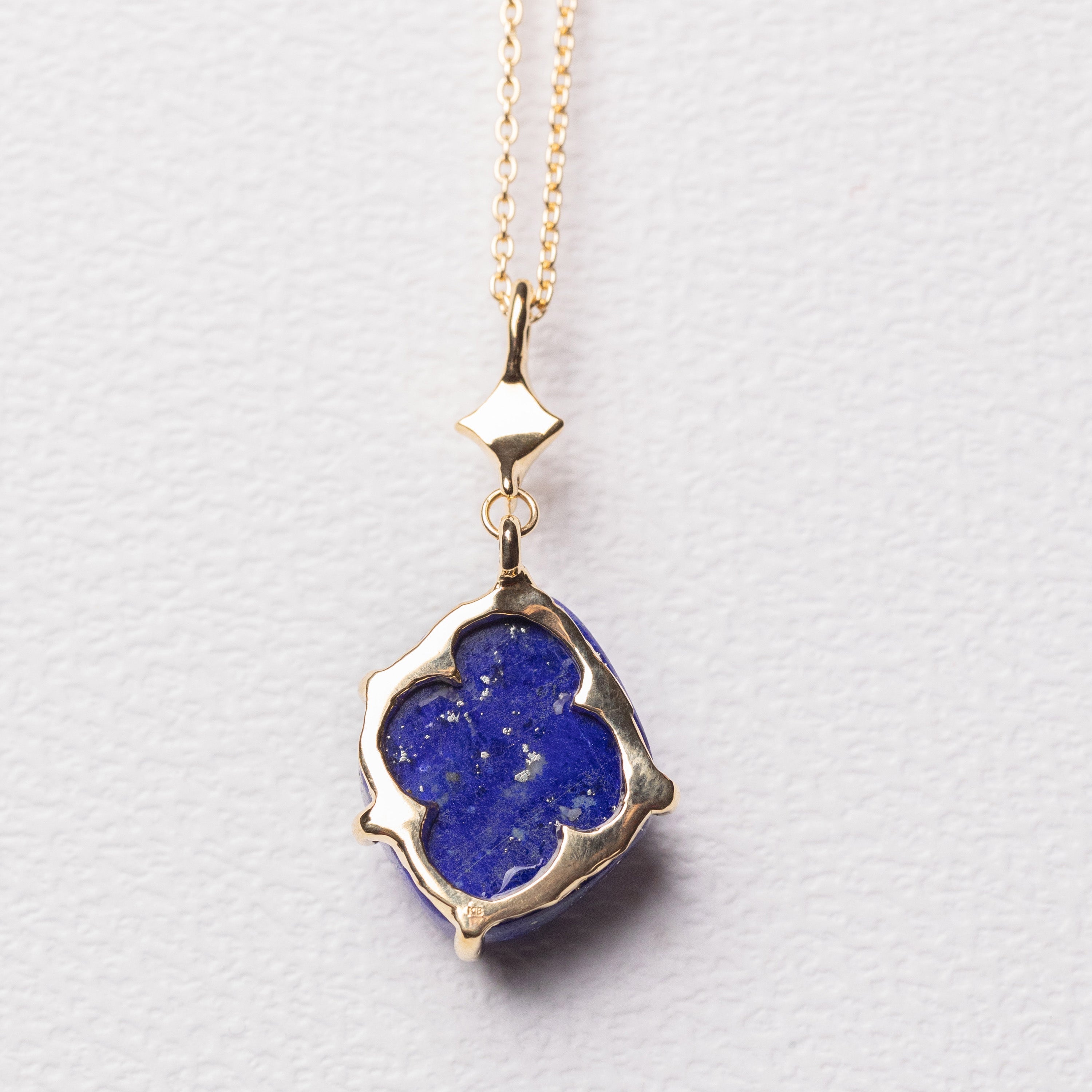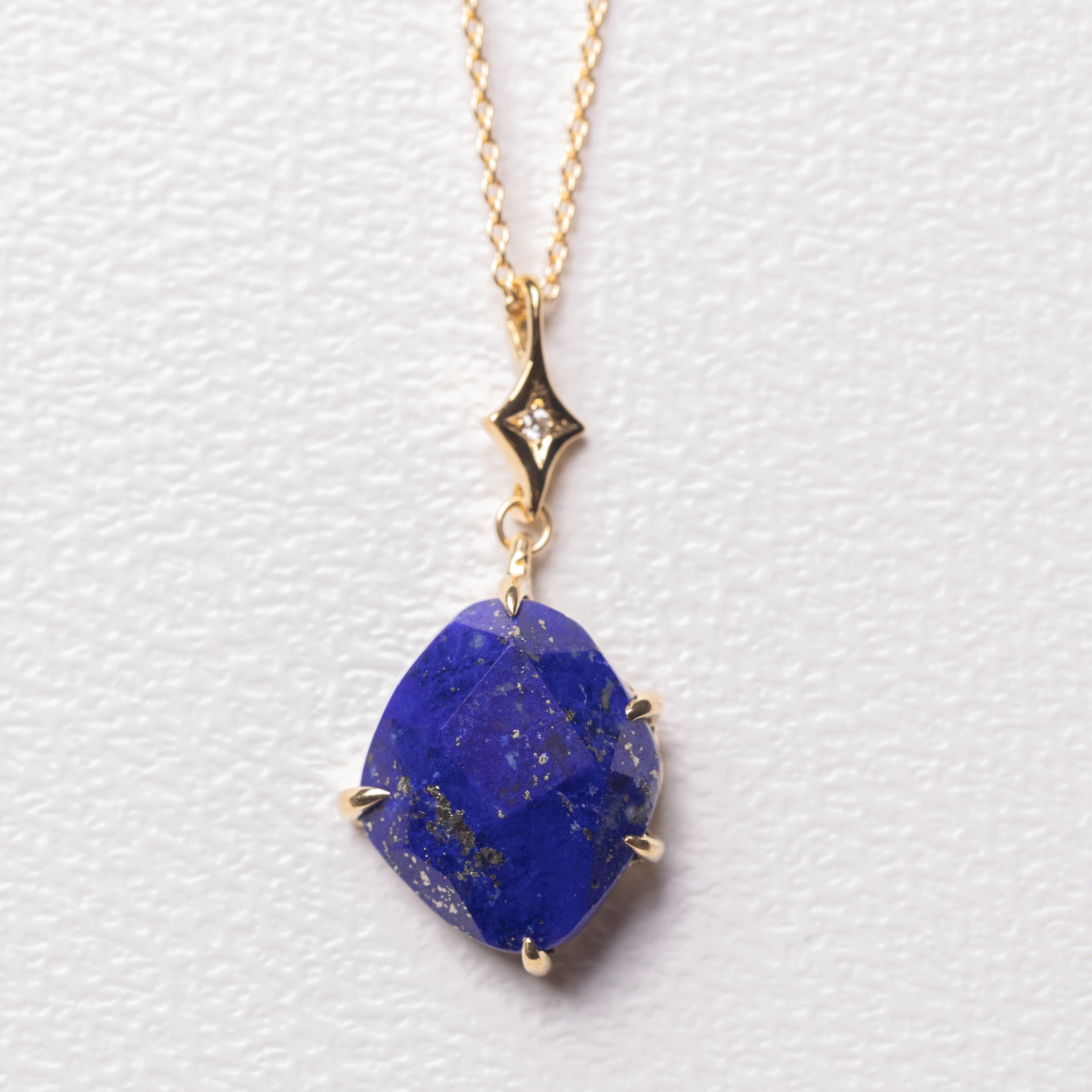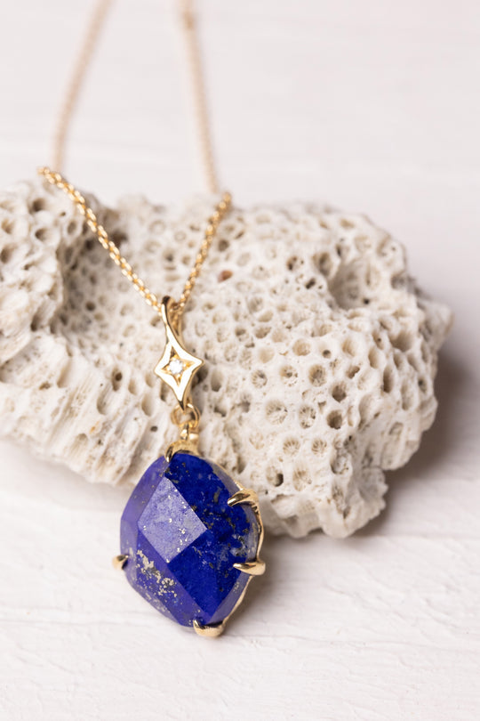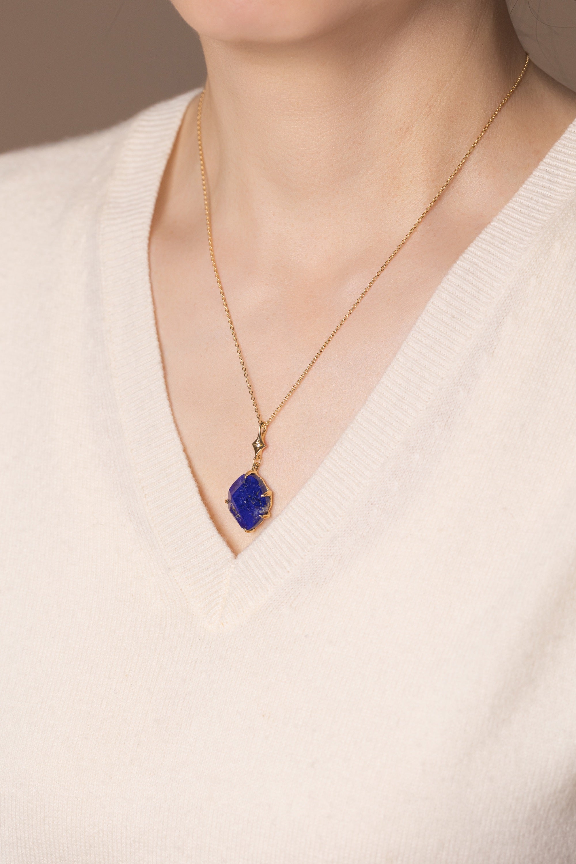 A deep blue lapis hangs from a stardust, its presence grounding and calm. The stone has an organic, asymmetrical shape with a satisfying weight, giving it a sense of quiet confidence rather than delicacy. Its surface feels natural and expressive, inviting a closer look.