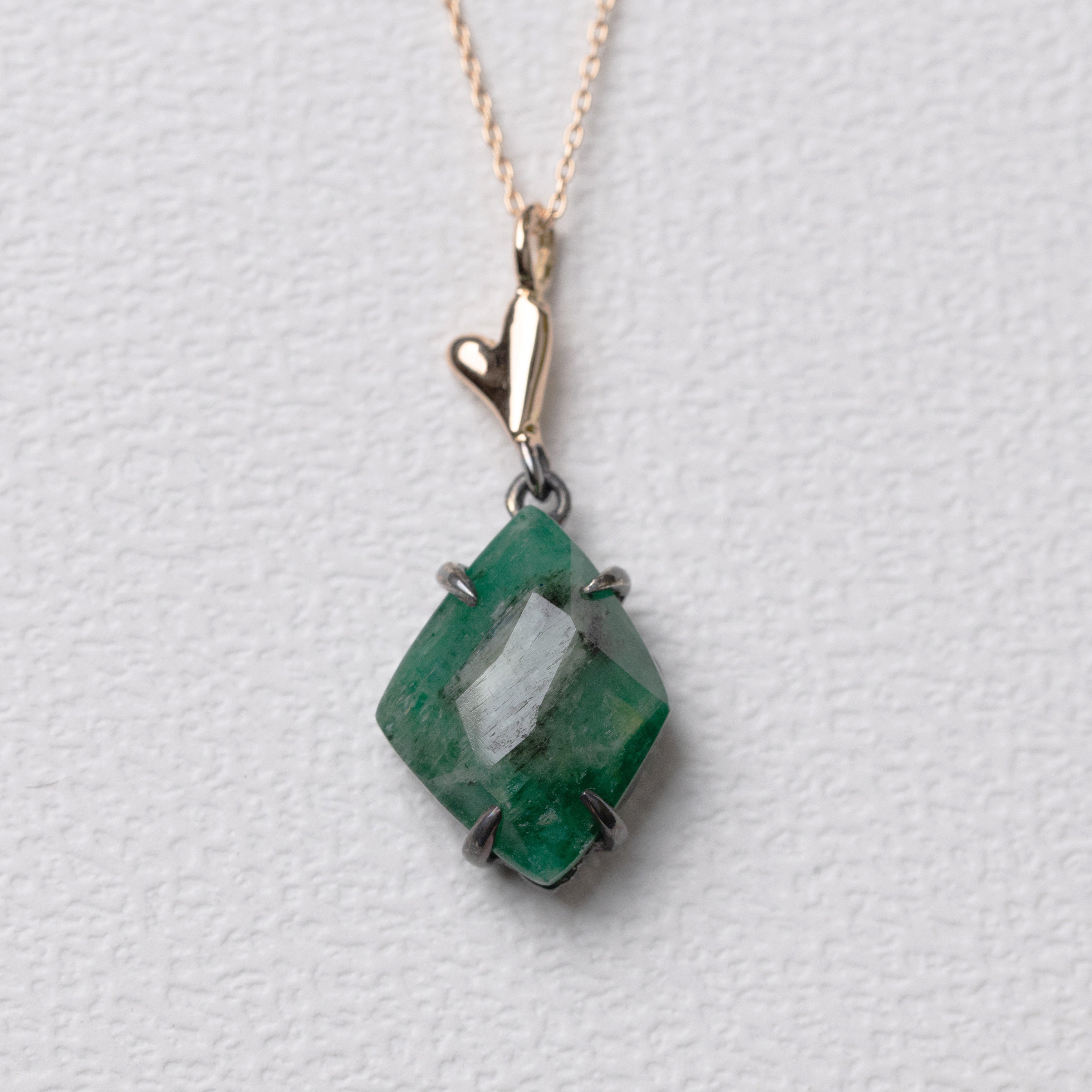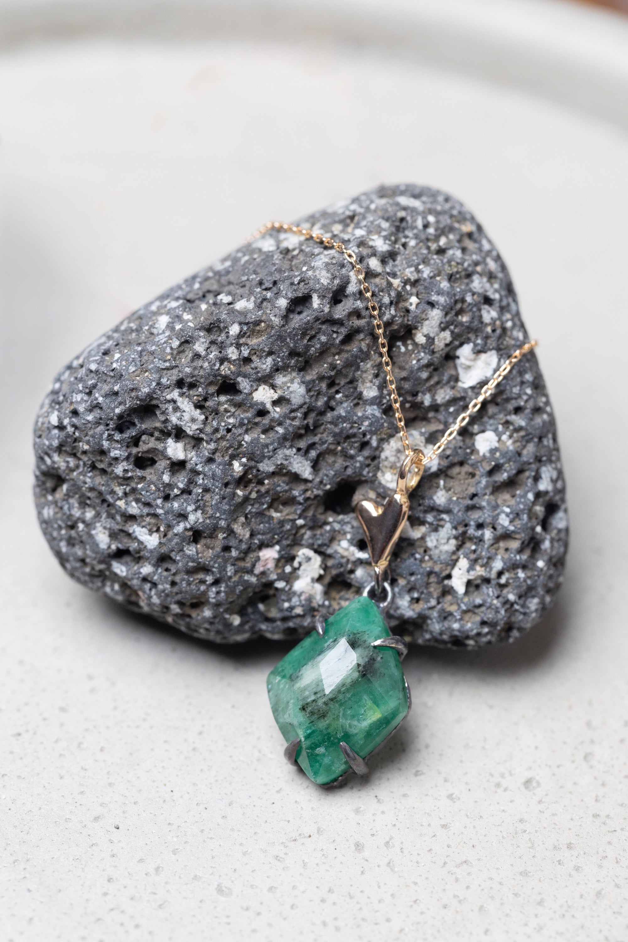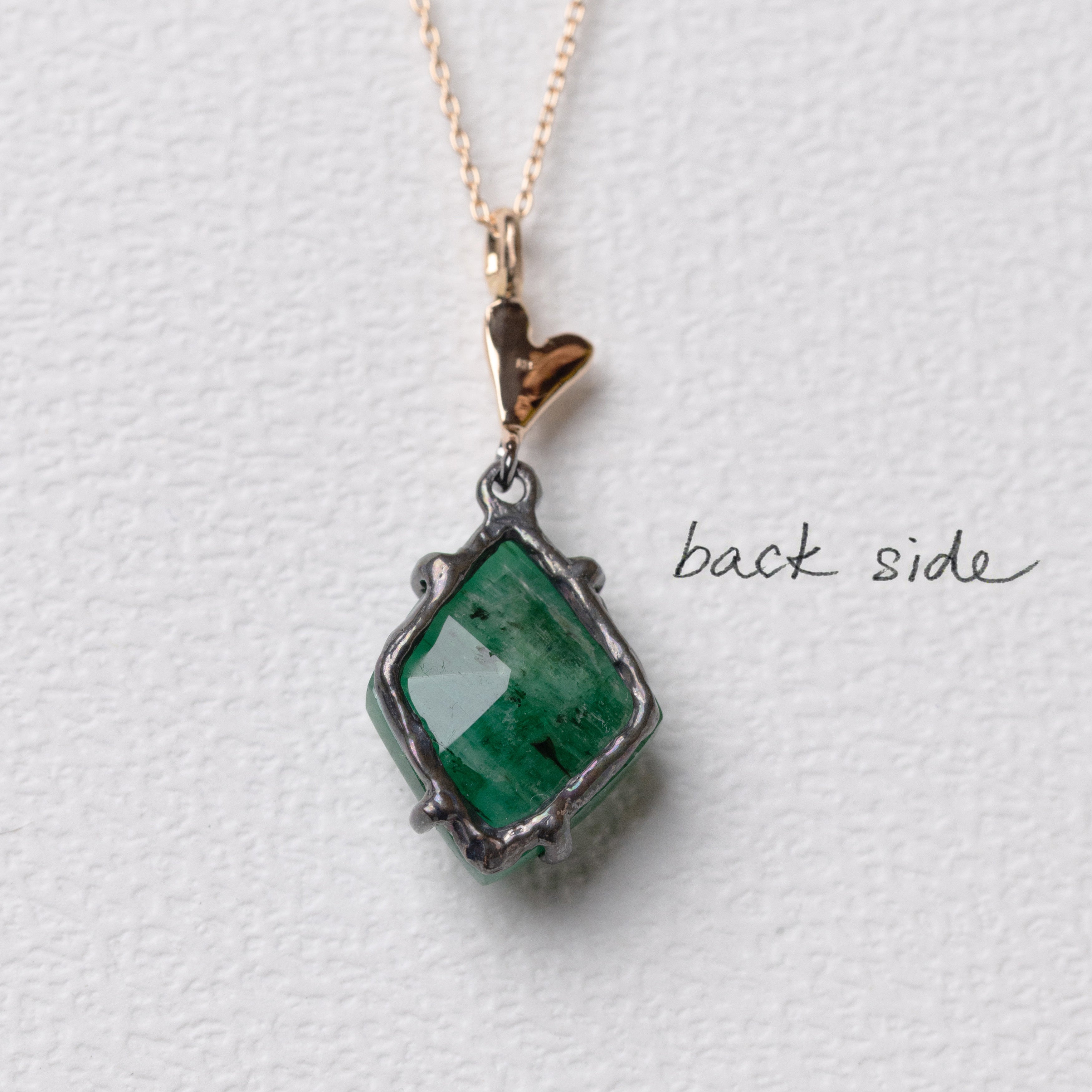 The pairing of deep, rich green with pink gold shouldn't work as well as it does — and yet it's exactly right. The oxidized silver prongs add a third voice to the conversation, a darker note that pulls the green even further into itself. It's the contrast that does it: the high shine of the pink gold heart against the mellow, earthy tones of the emerald and its setting. Worn against the skin, this piece feels like a small, personal piece of nature — unhurried, a little mysterious, and entirely its own.