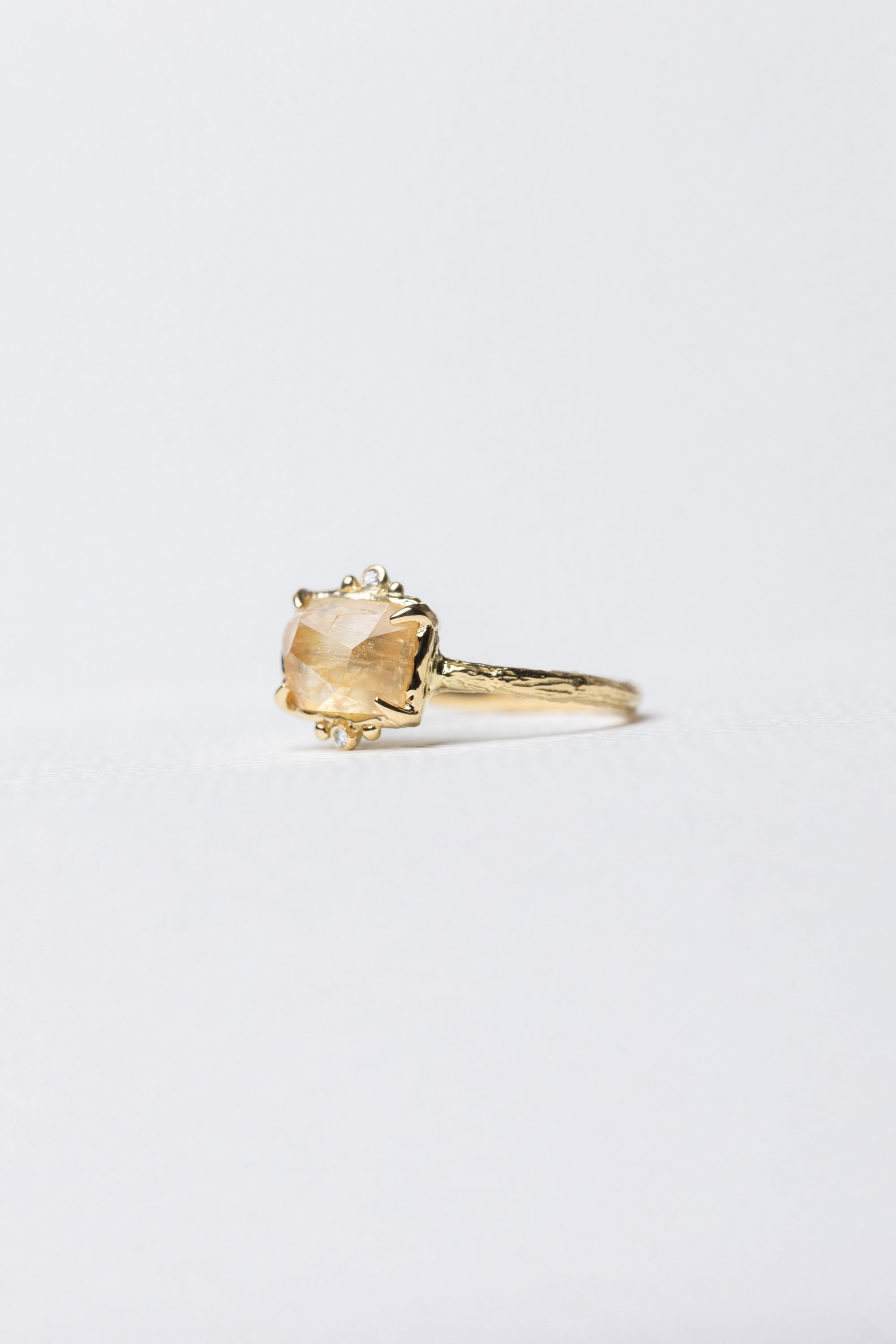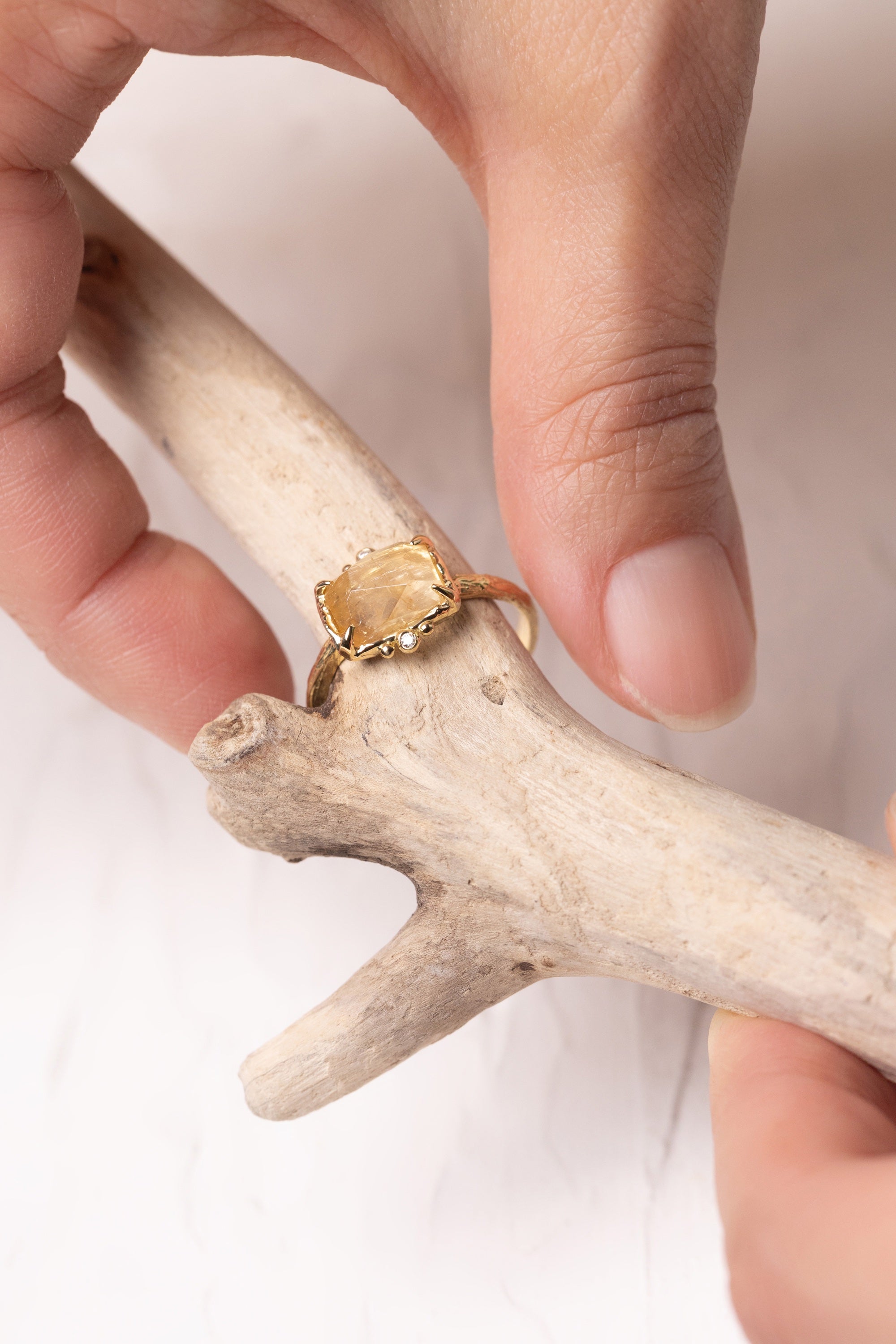Set on a textured branch band, the ring feels connected to something older—rooted. The straight form contrasts gently with the movement of the stone, giving a balance of form and feeling.