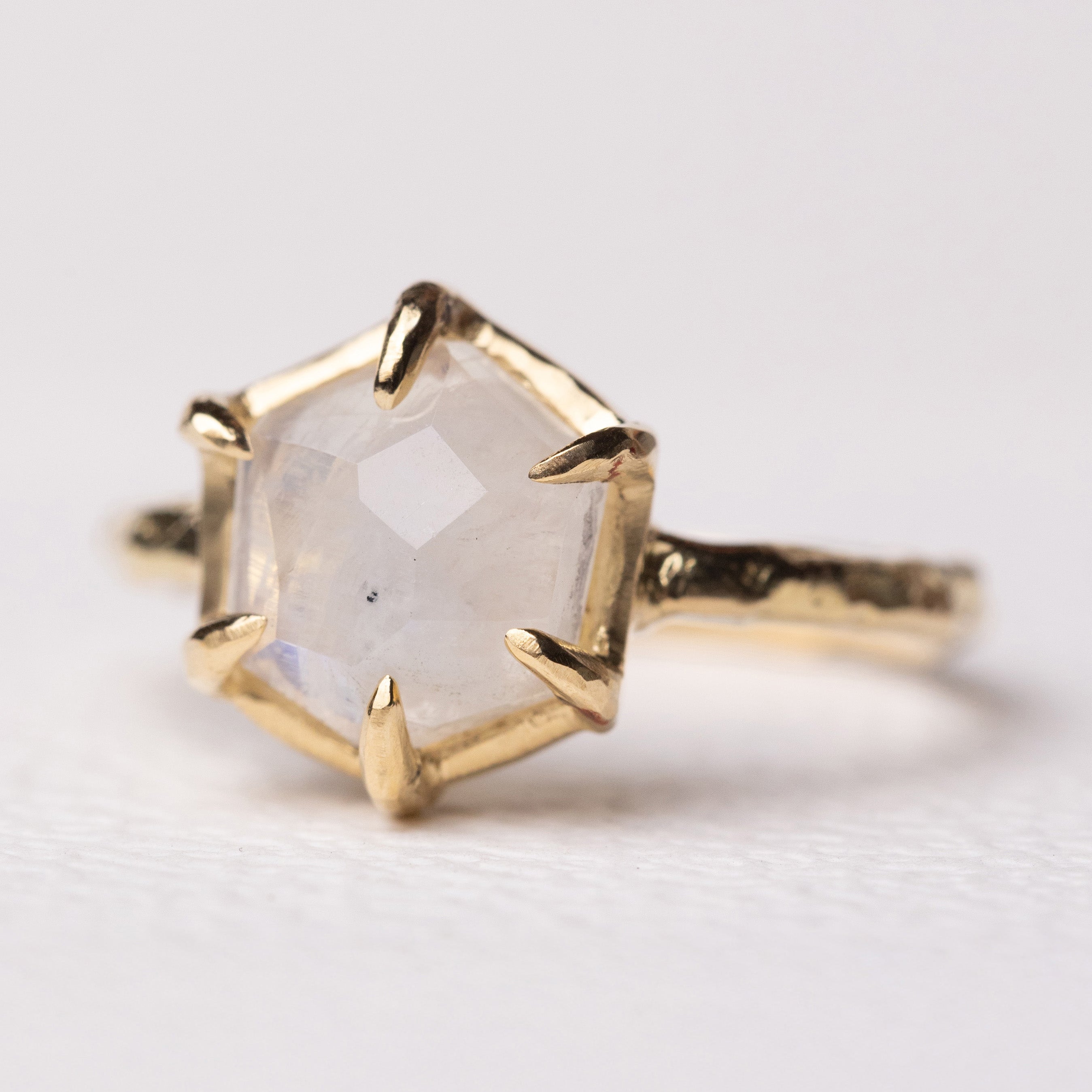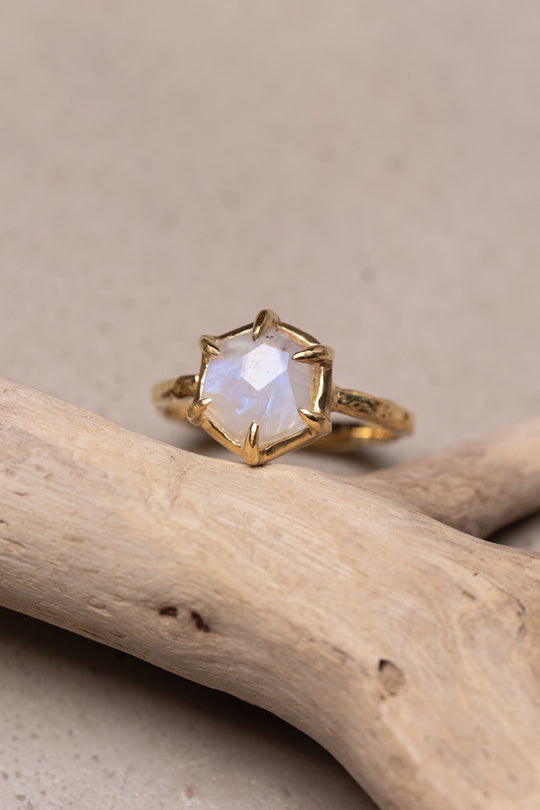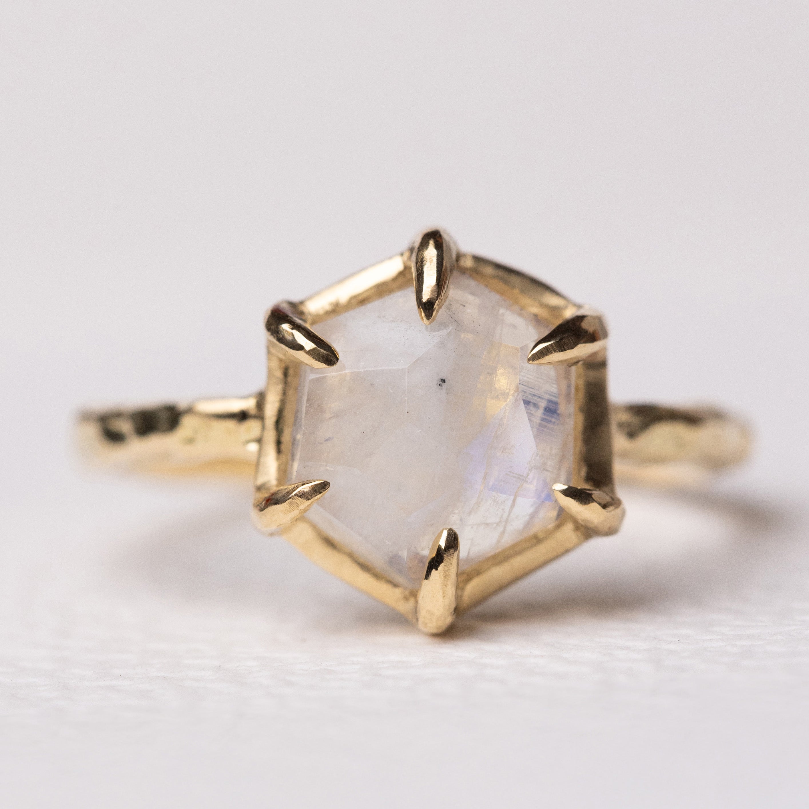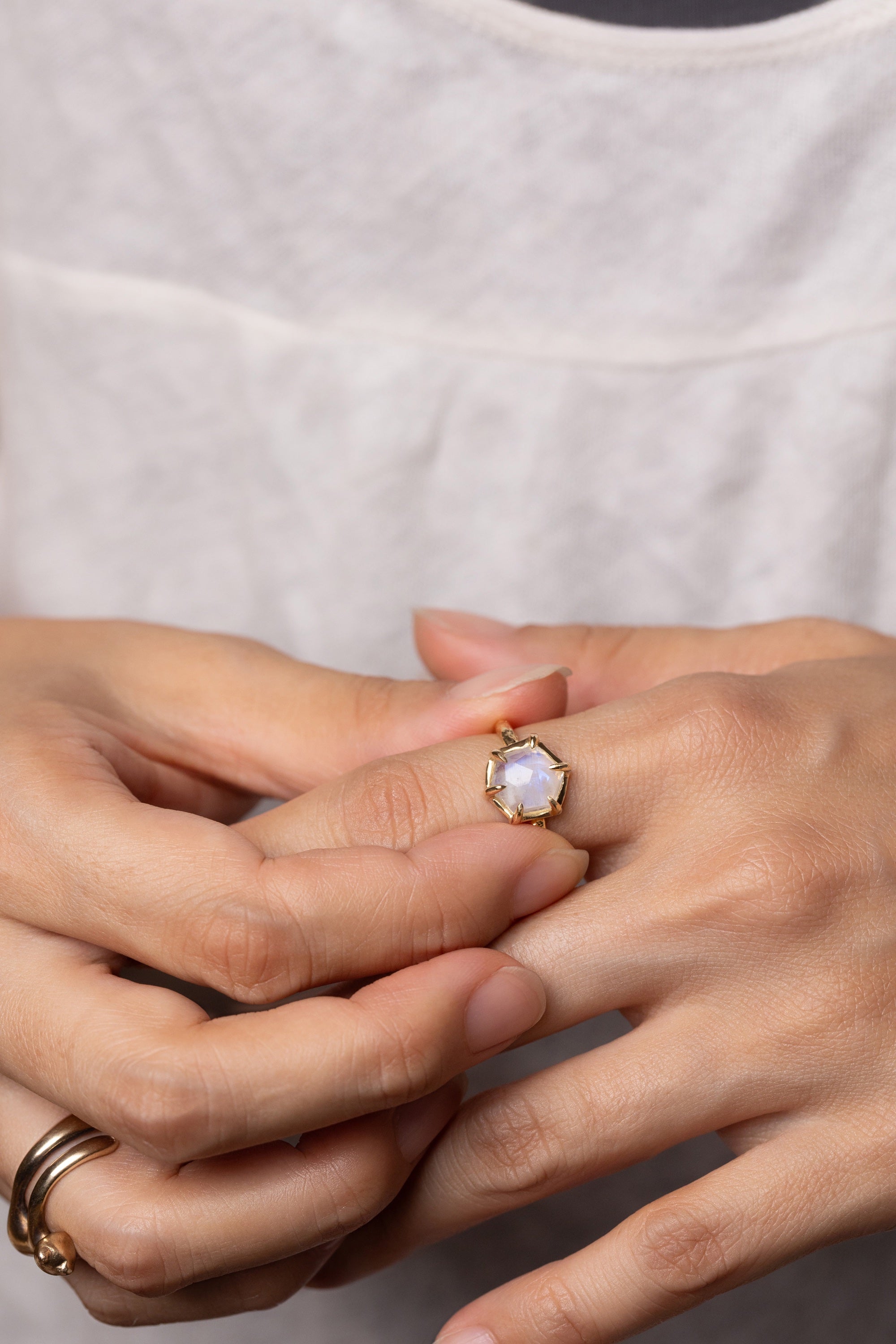 At the heart of this ring lies a hexagon-shaped blue moonstone, its glow shifting with a gentle iridescence. The form feels distinct, offering a different impression that balances geometry with softness.