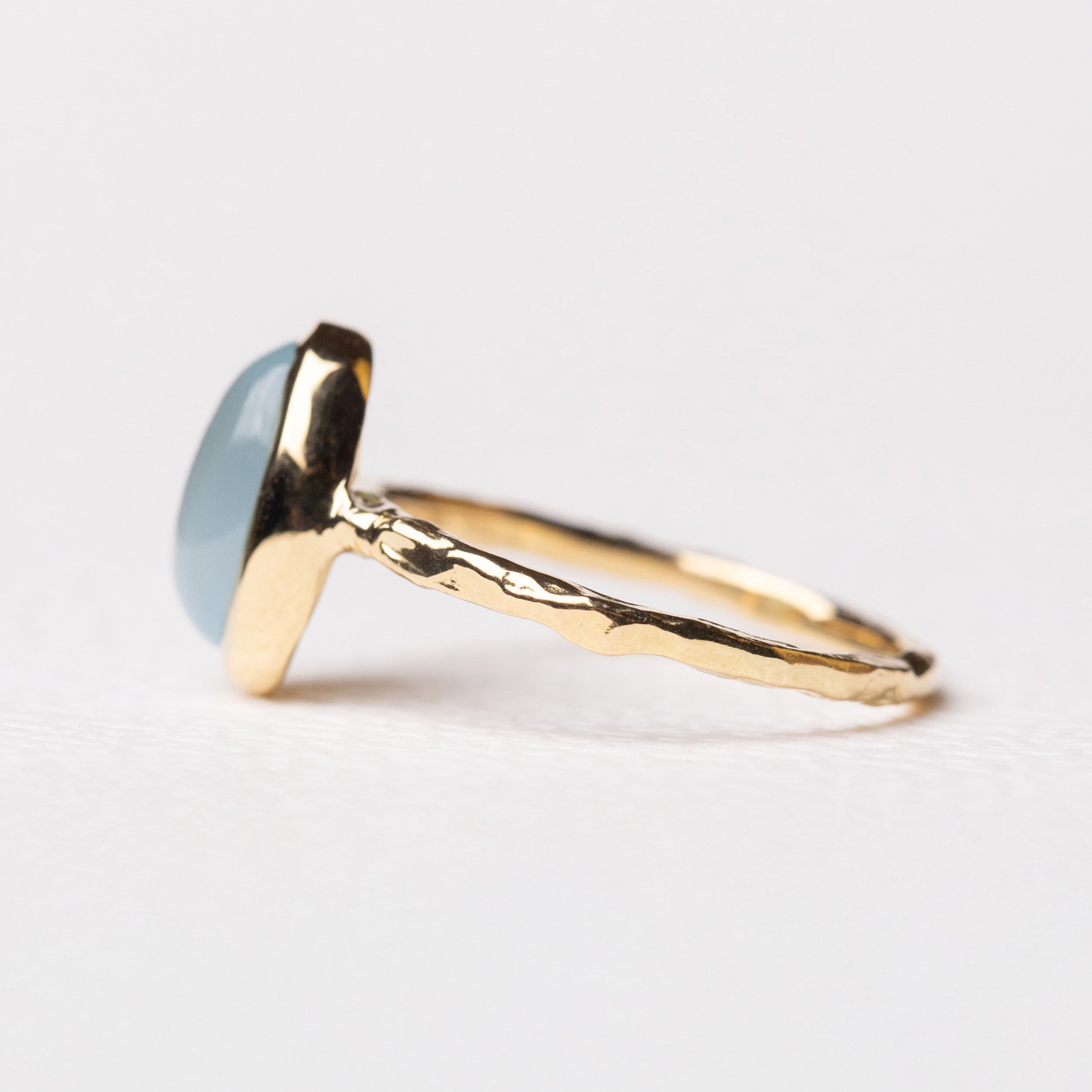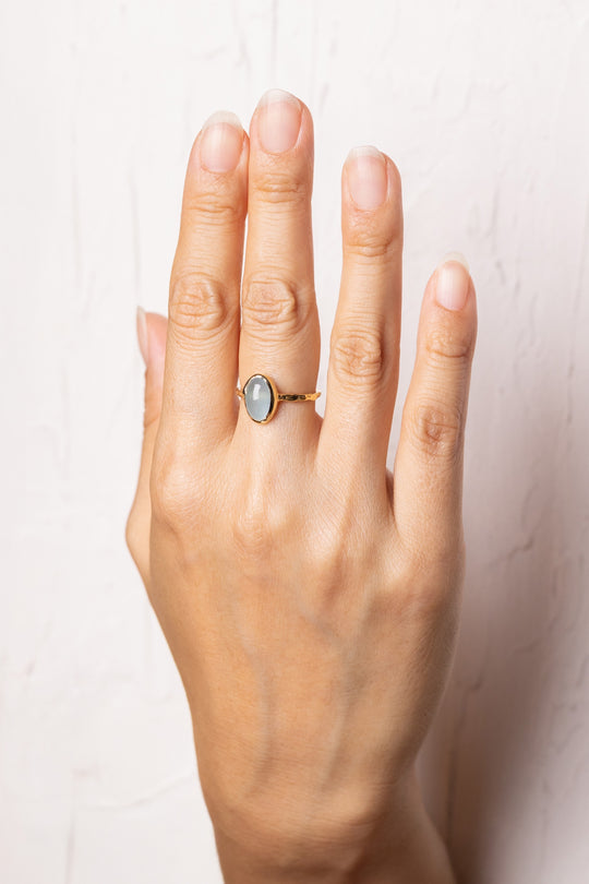This petite aquamarine cabochon has a milky baby blue color—soft, calm, and quietly cheerful. Even in a small size, the blue is prominent against the warmth of gold.