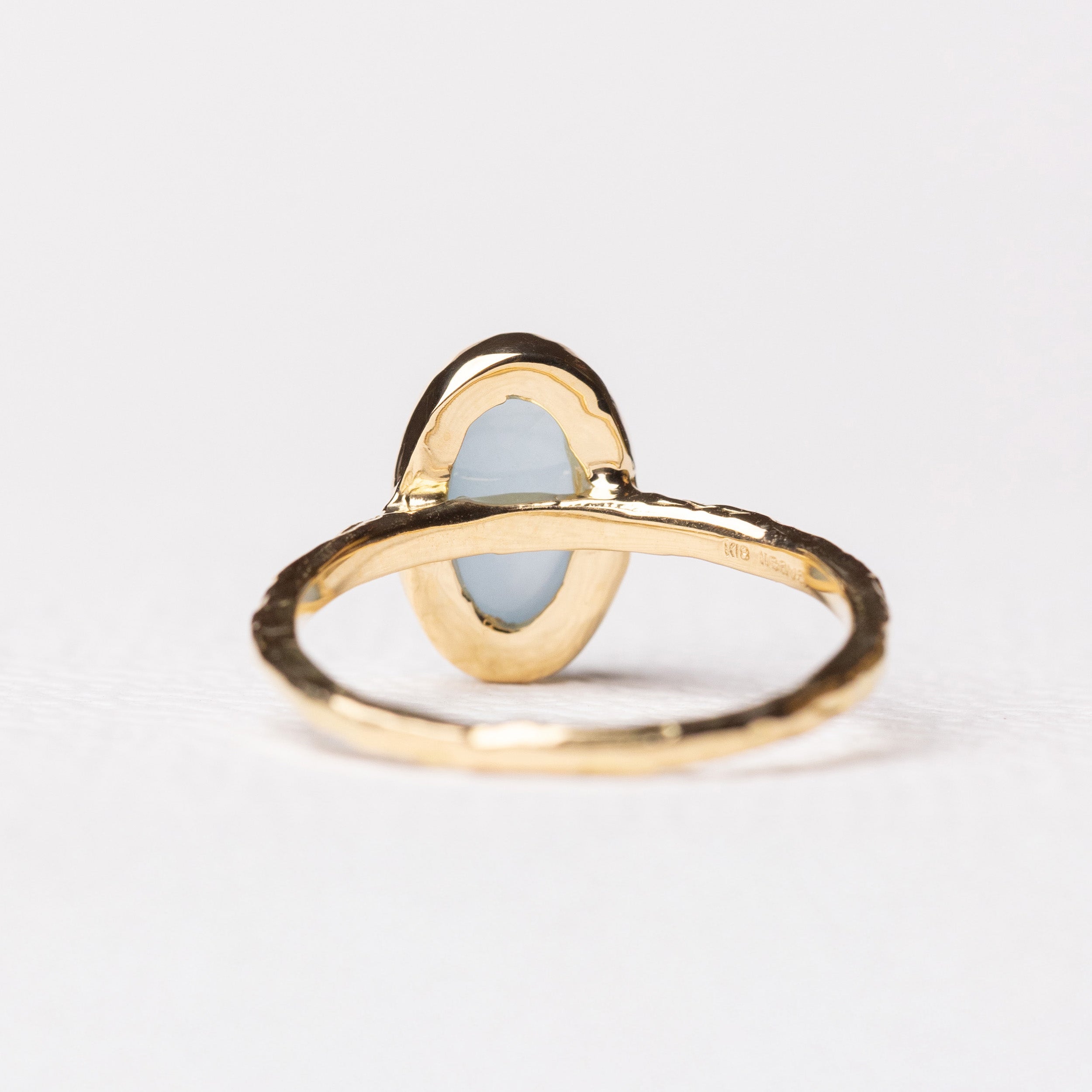 The stone is set in a textured band made in 18k gold. Without prongs, the smooth dome of the cabochon remains clean and uninterrupted.