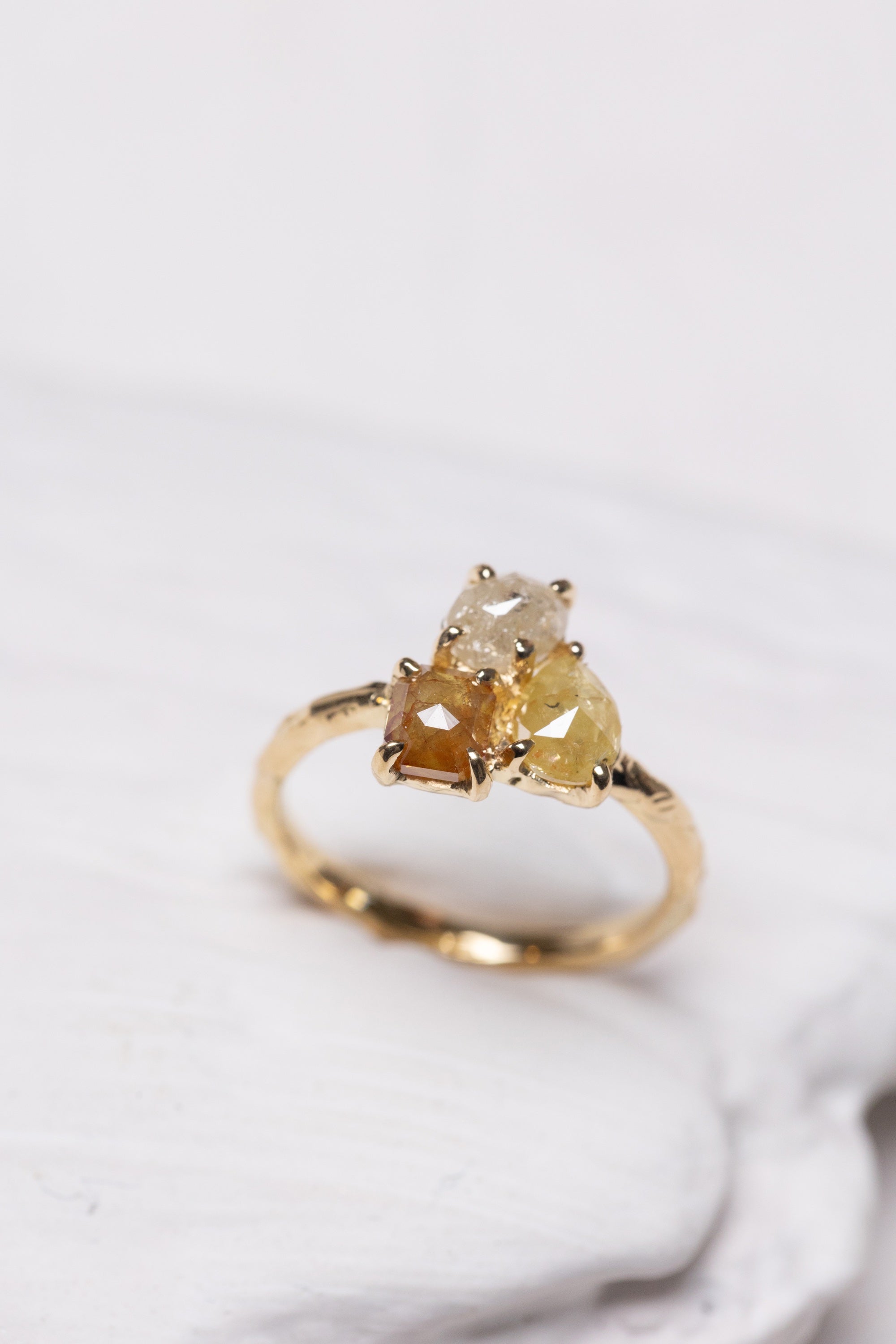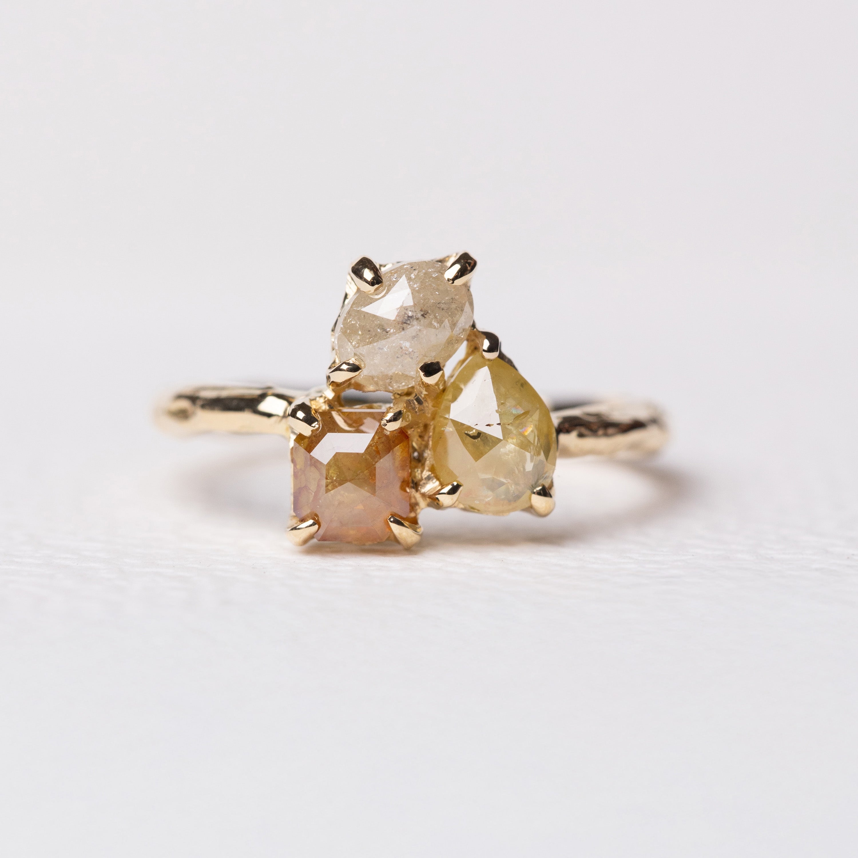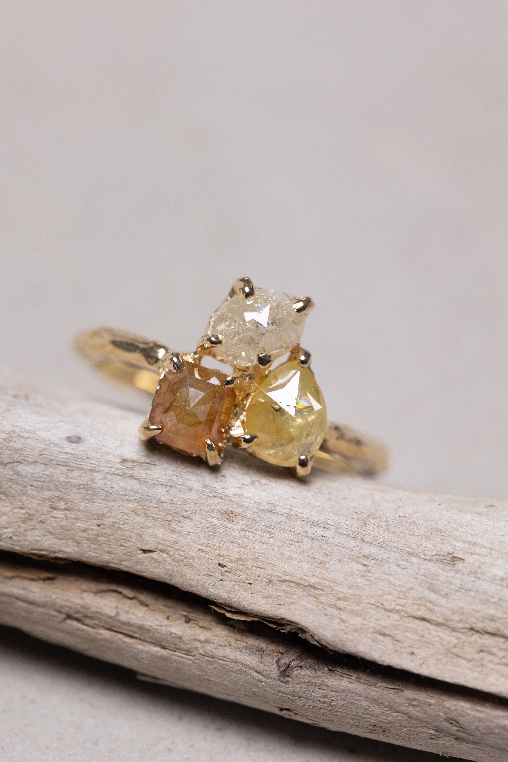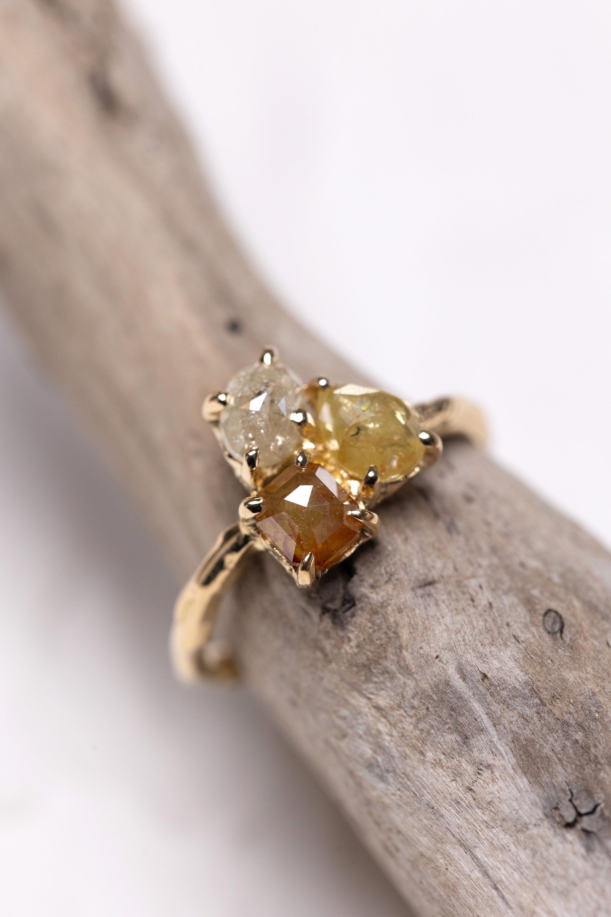 Three warm, autumn-toned diamonds sit side by side, forming a calm and graceful harmony. White, yellow, and brown-red—each stone carries its own character, yet together they create a subtle, classic presence on the hand.