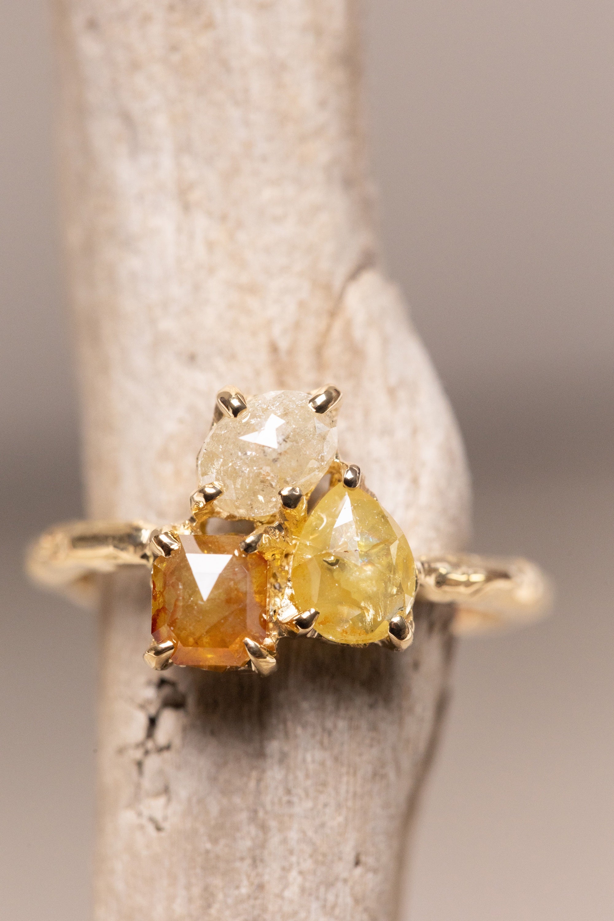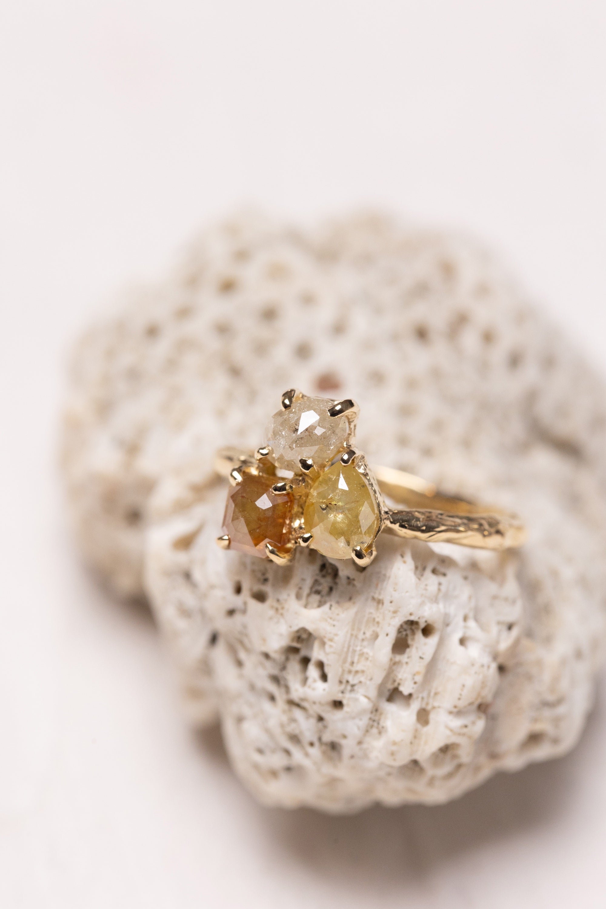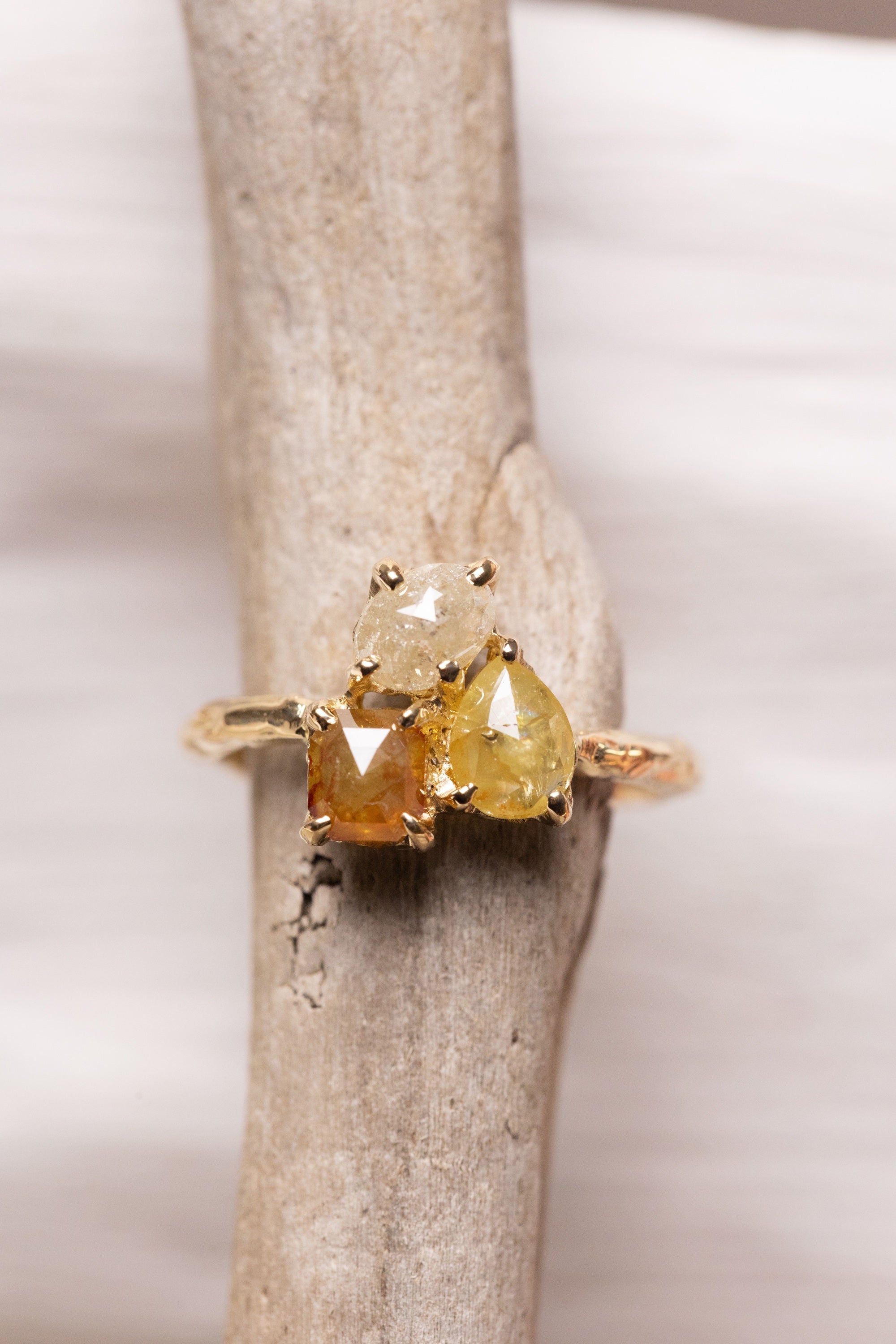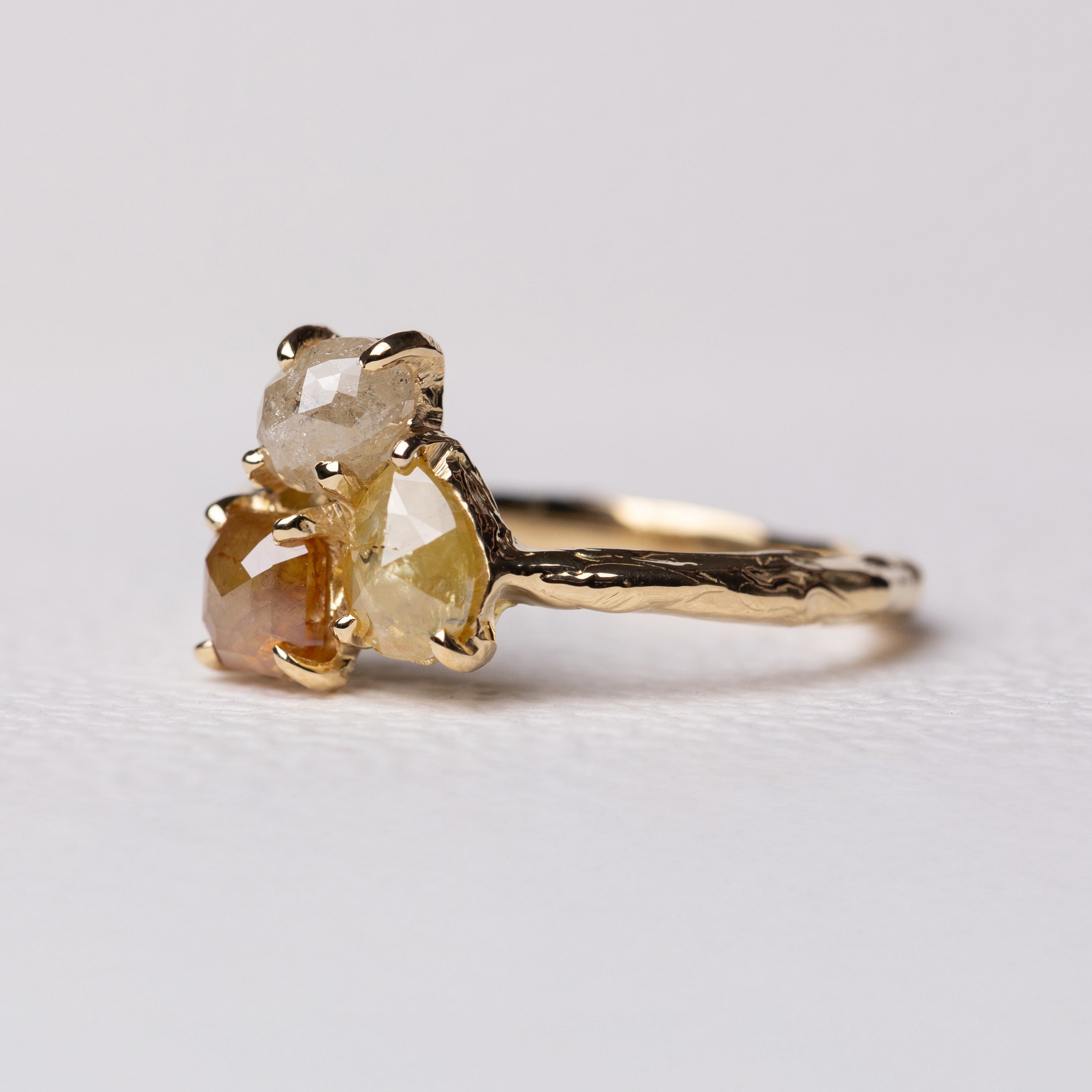 Three warm, autumn-toned diamonds sit side by side, forming a calm and graceful harmony. White, yellow, and brown-red—each stone carries its own character, yet together they create a subtle, classic presence on the hand.