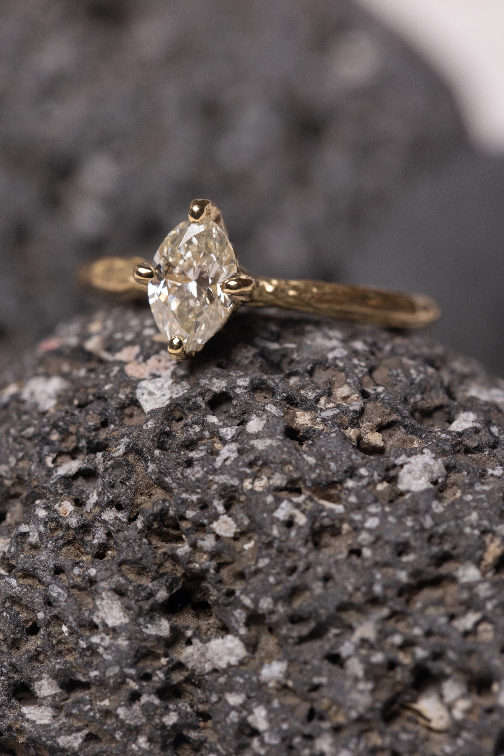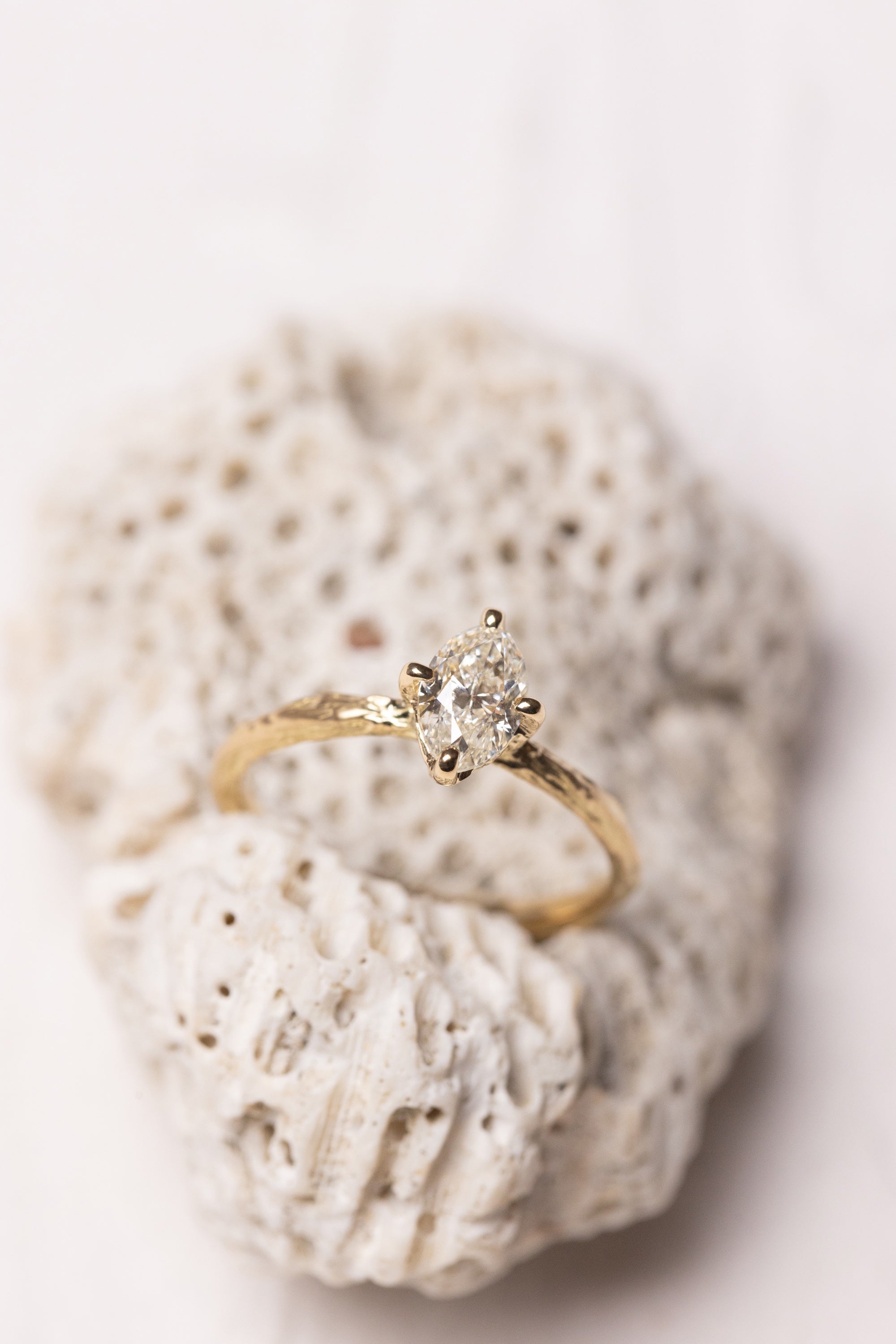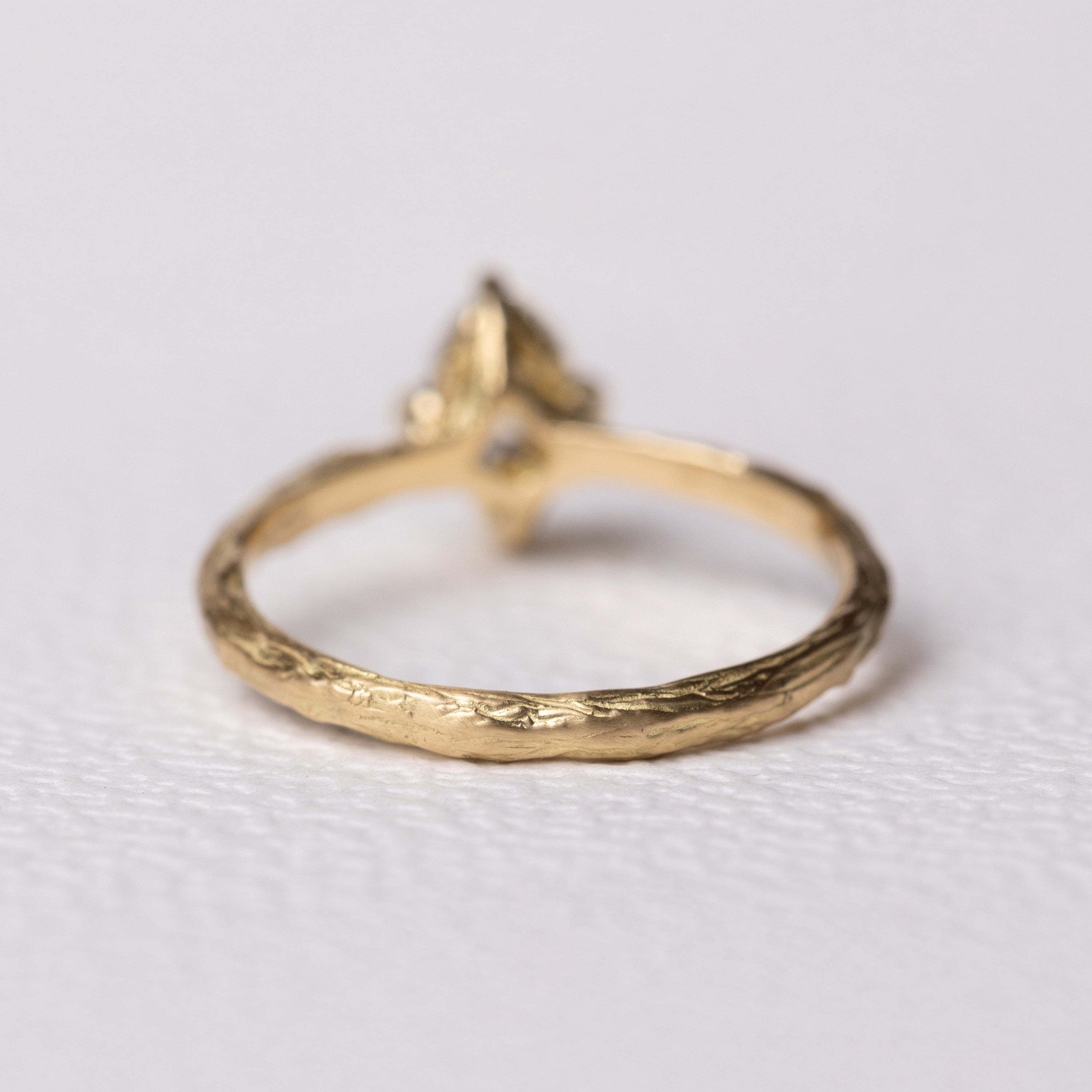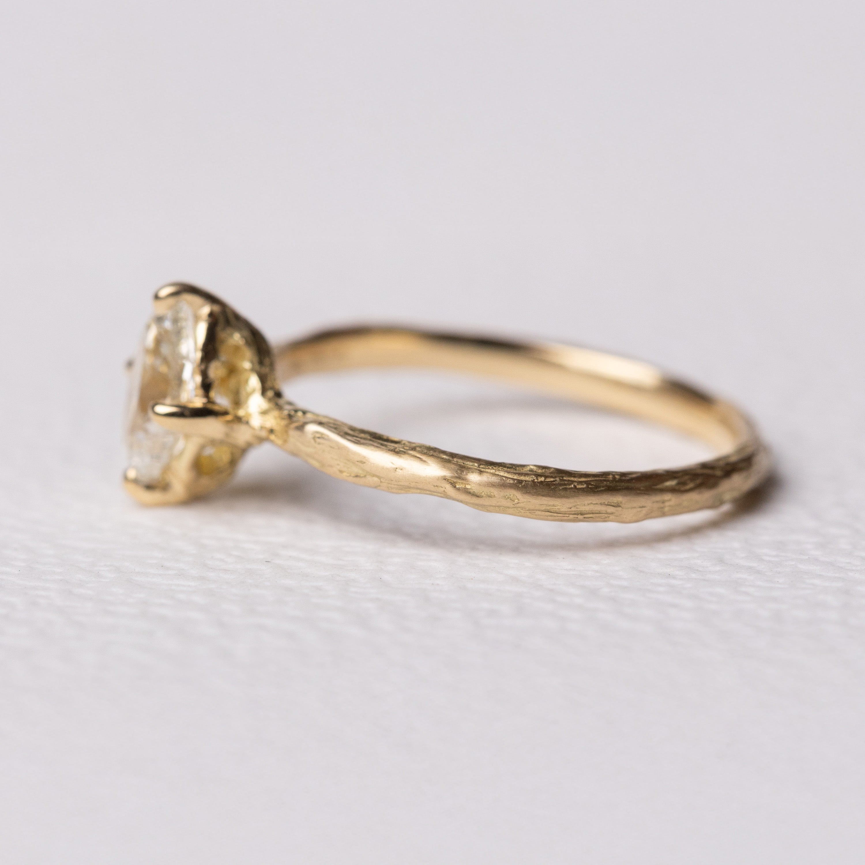 What makes this ring quietly distinctive is the way the stone is held. The prongs rise naturally from the band, as if they are extensions of a small branch reaching upward to support the diamond. This detail creates a seamless connection between stone and setting, blending structure with an organic softness.