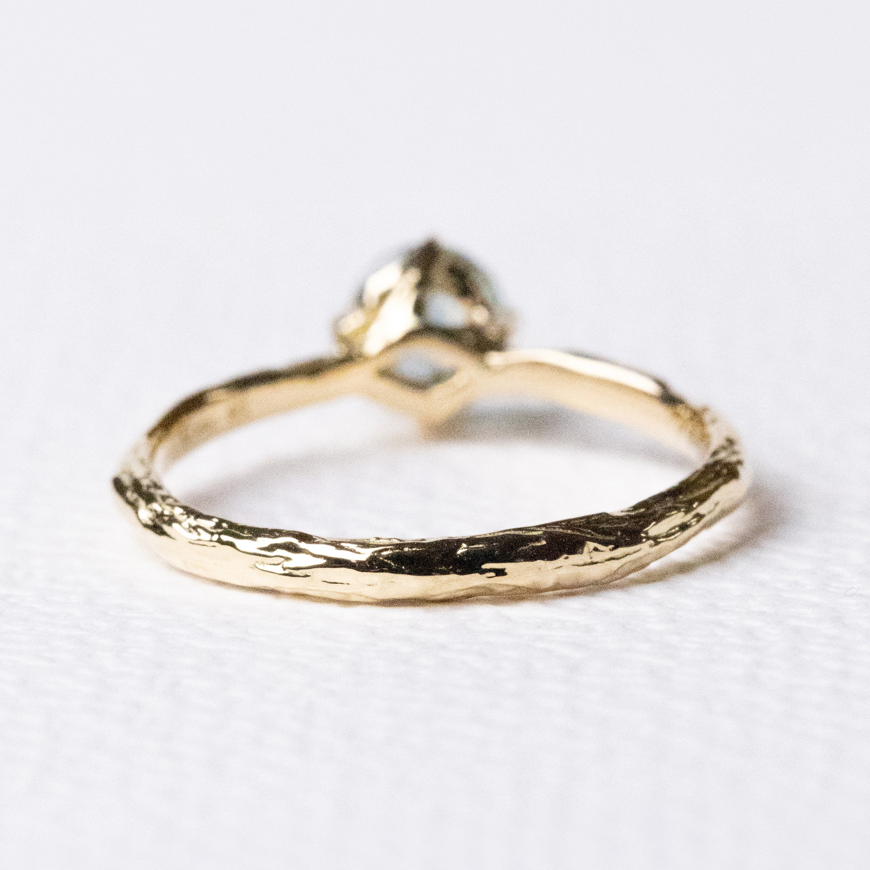 The design is a simple solitaire, allowing the stone’s character to shine. The branch texture adds quiet personality, yet the ring remains classic, elegant, and easy to wear every day.