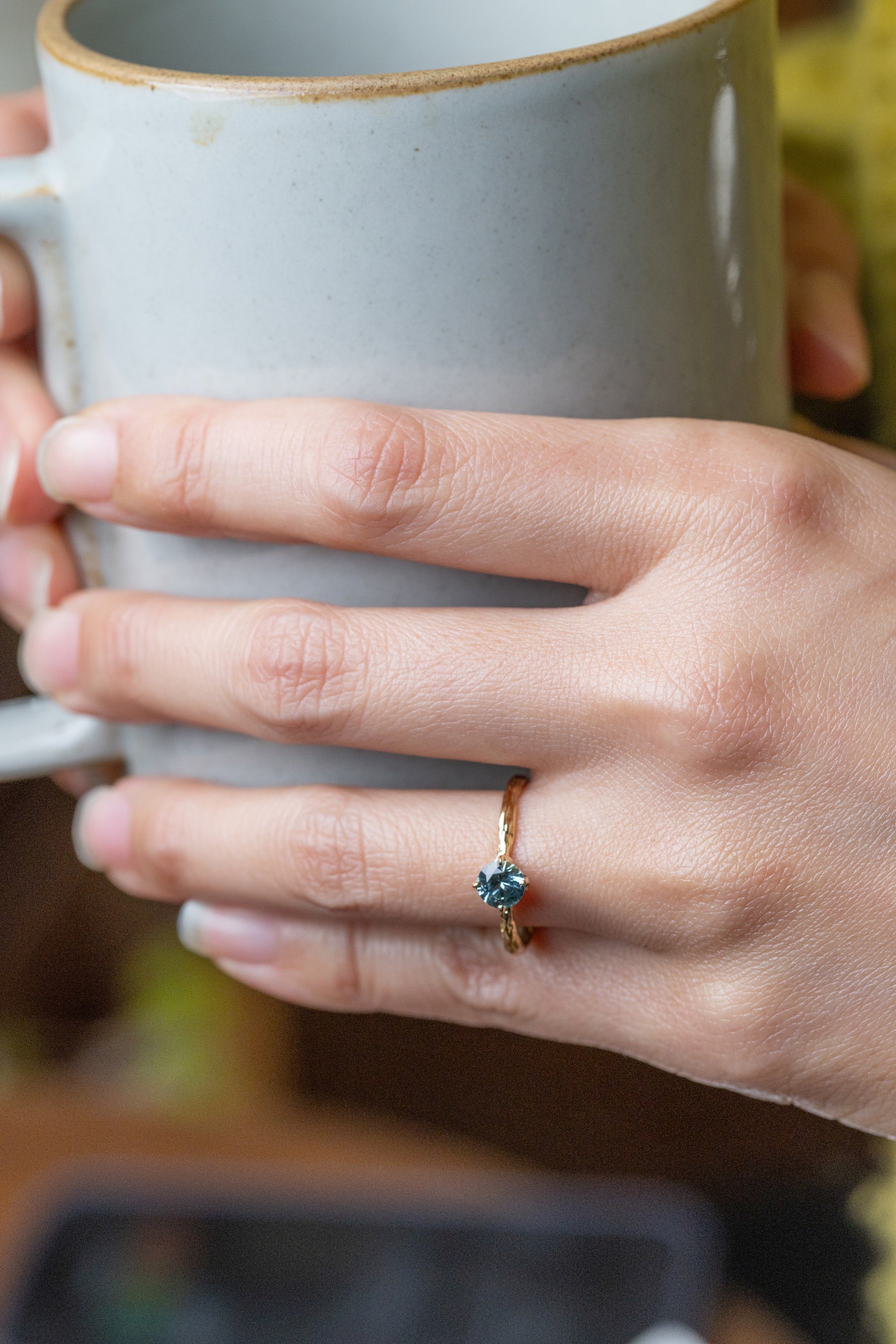 A natural, unheated Montana sapphire rests quietly on a straight branch ring made in 18k gold. The subtle branch texture brings a soft, organic feeling, while the teal blue stone adds a calm and graceful touch.