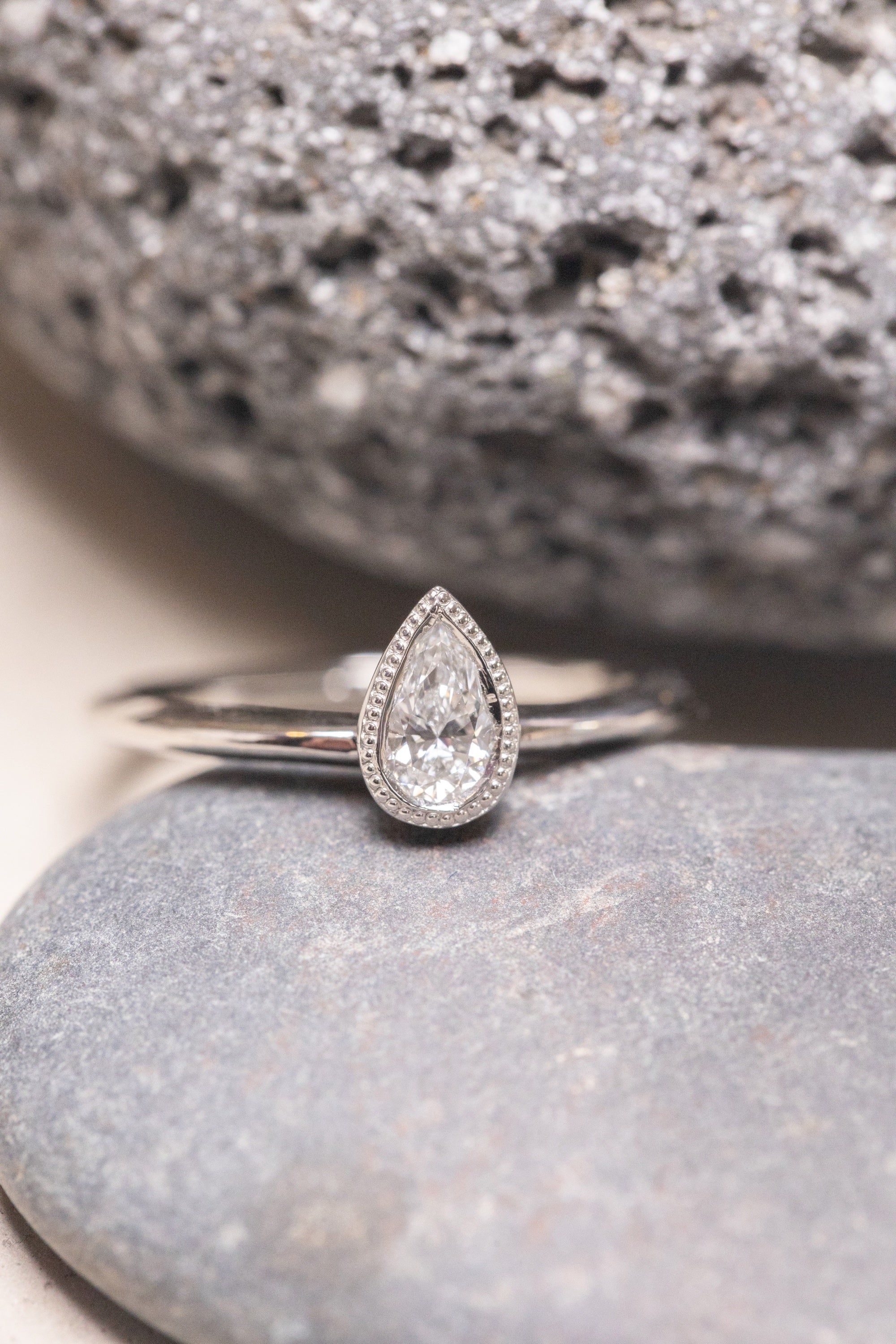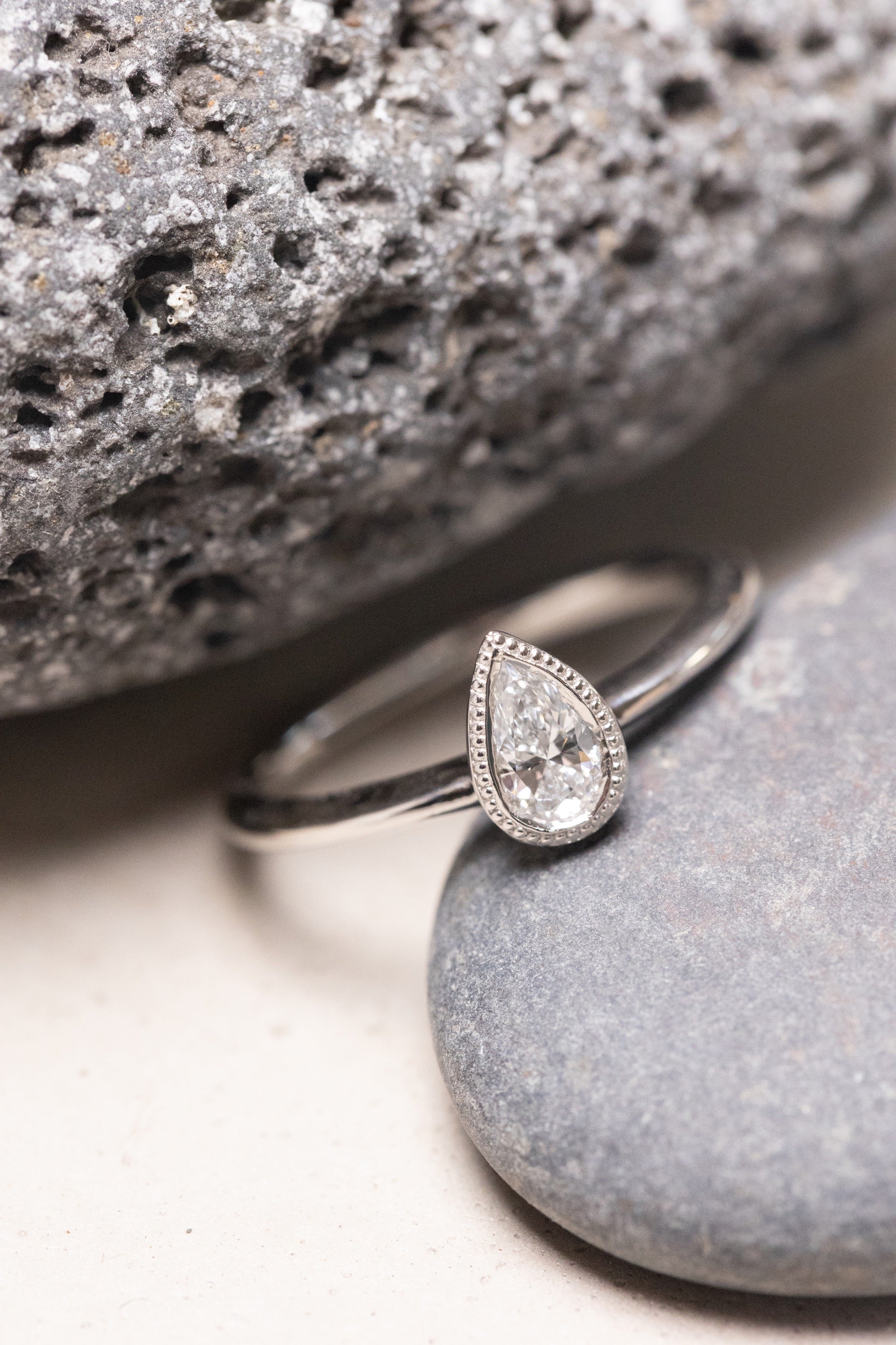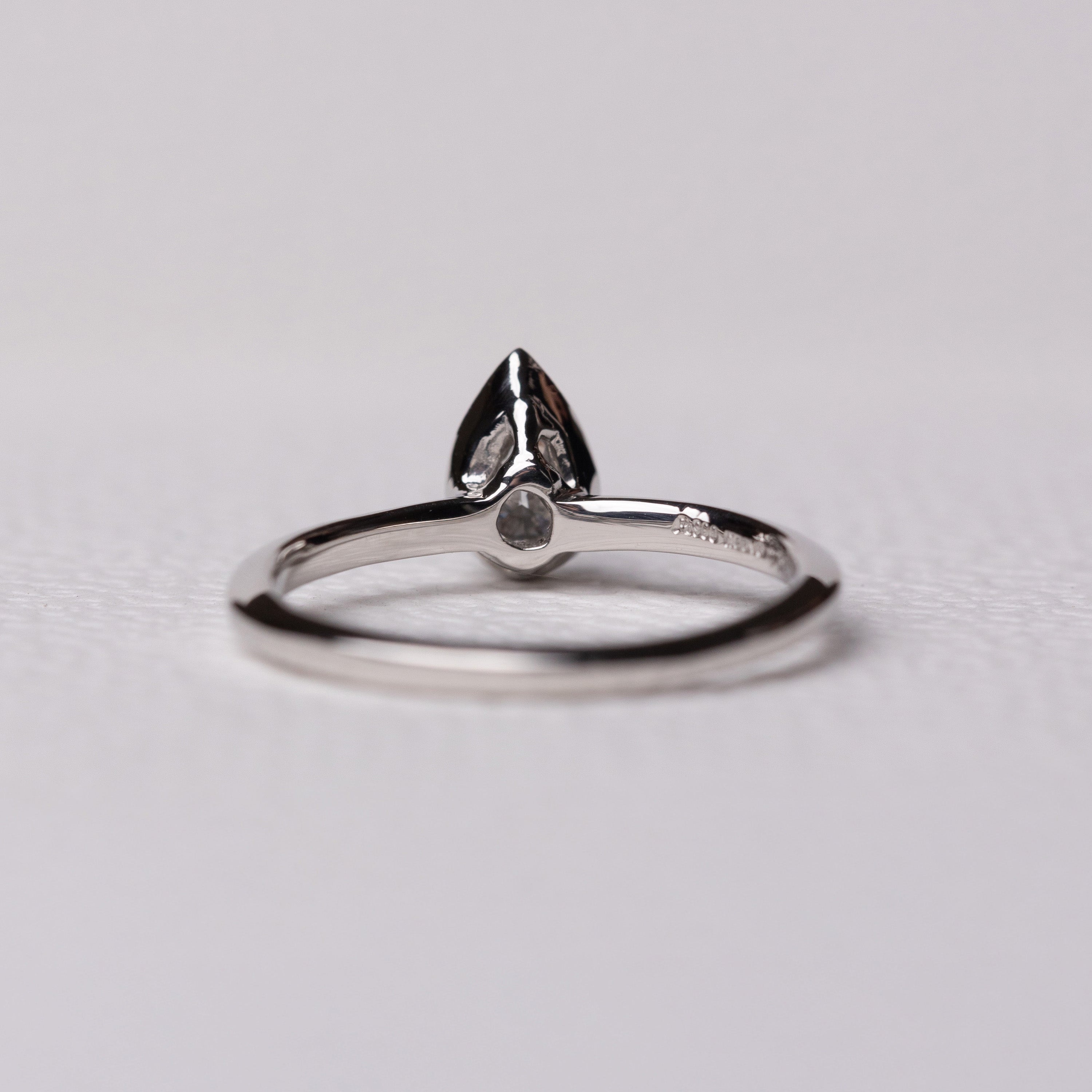 The clear brilliance of a pear-shaped diamond is gently held by a simple design, allowing its natural beauty to settle into a calm, elegant expression.