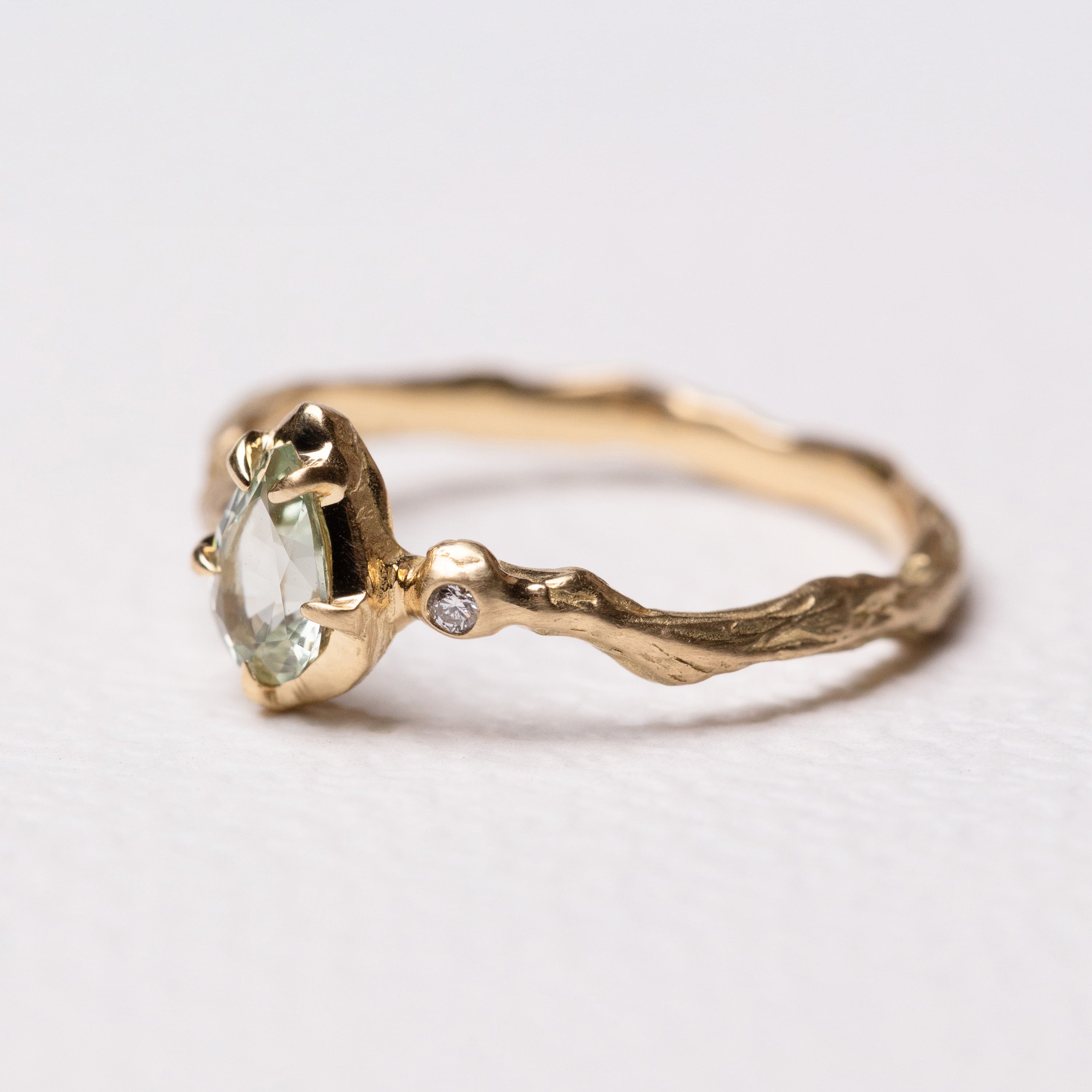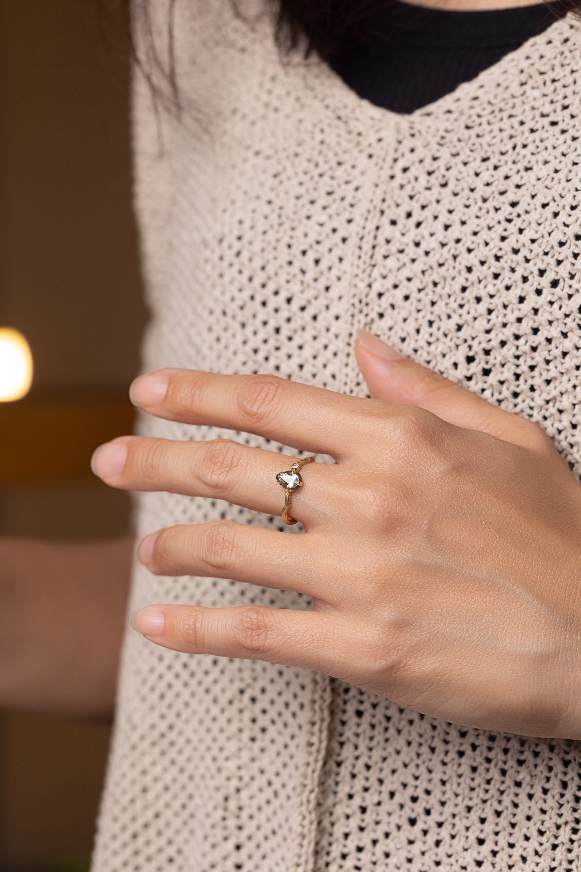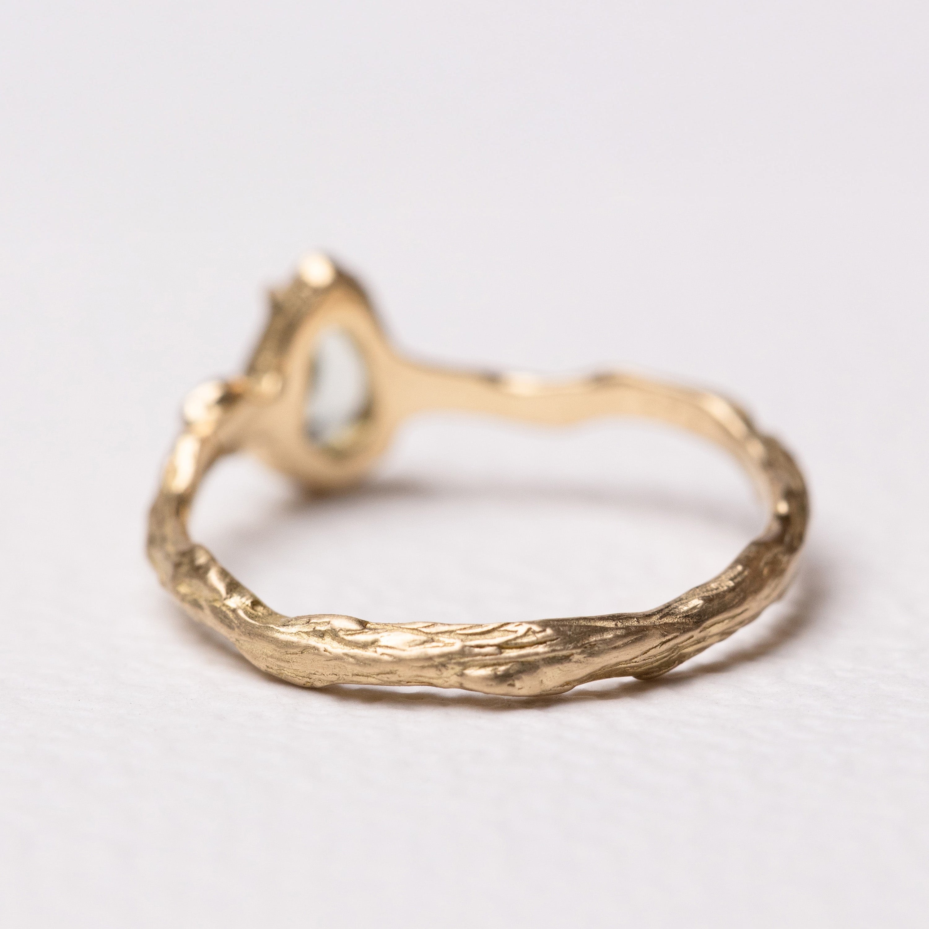 It sits on a slender branch ring made in matte gold. The organic texture of the band gently frames the bright stone.