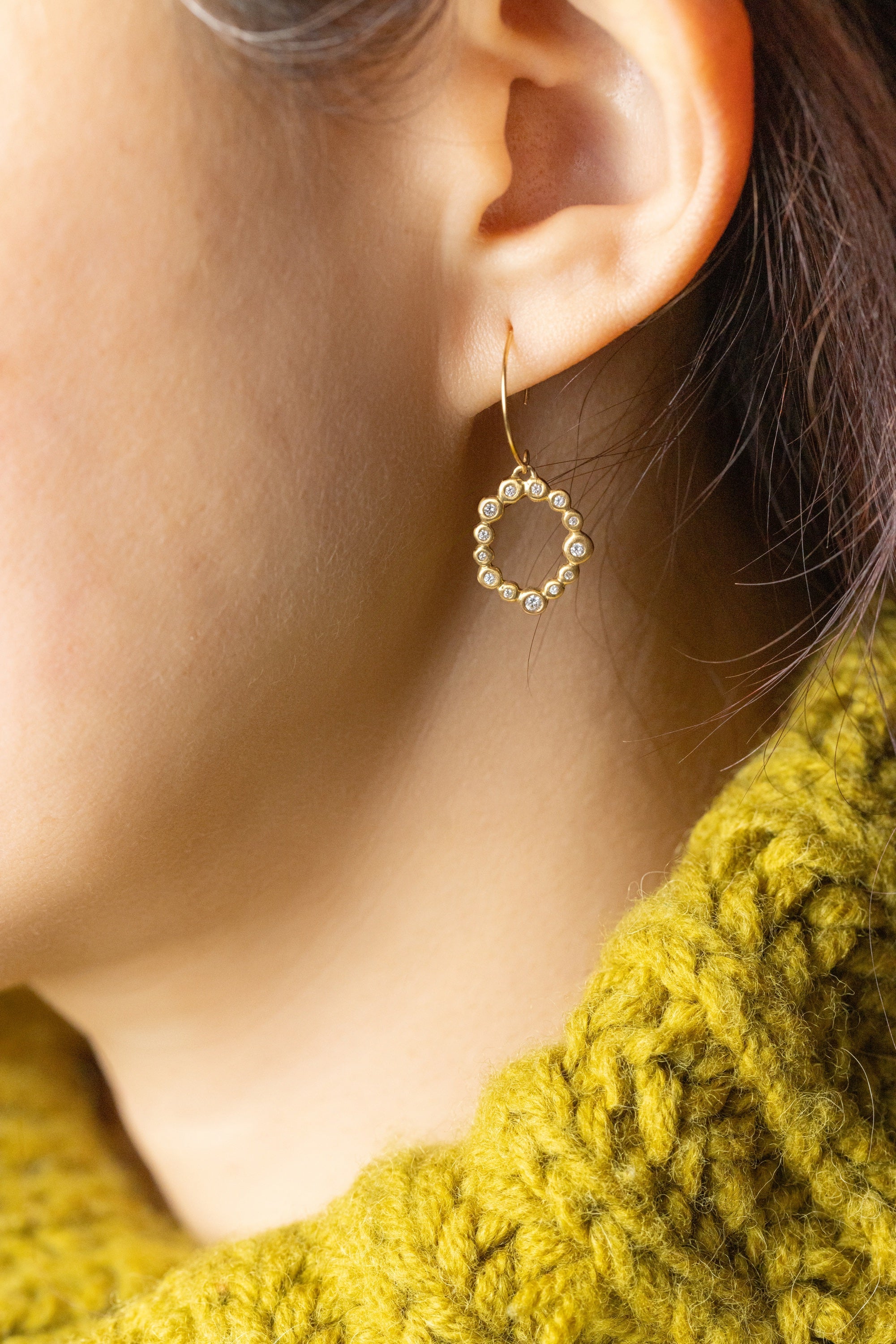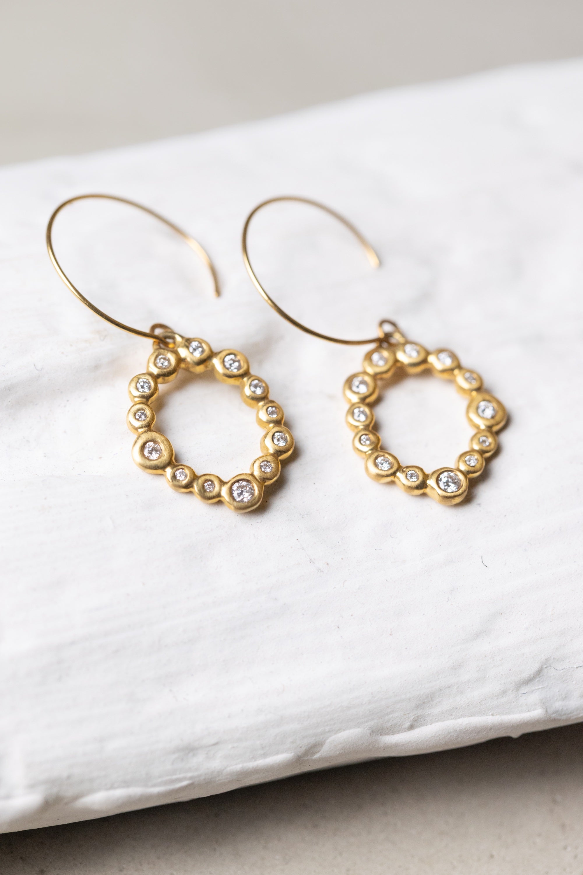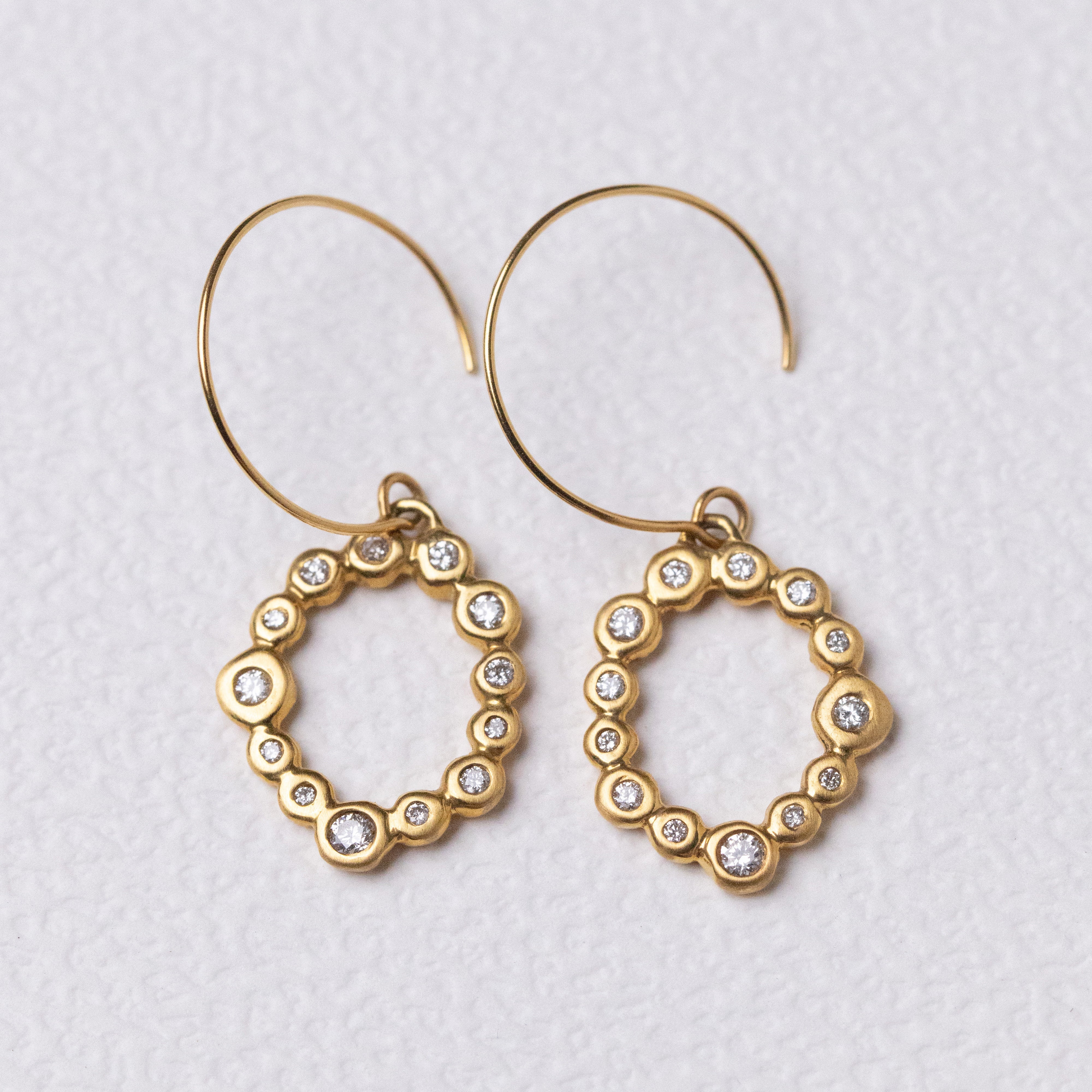 These earrings move lightly, like small bubbles rising in a glass of champagne. The diamonds are set in slightly different sizes, creating a natural rhythm as they sway.