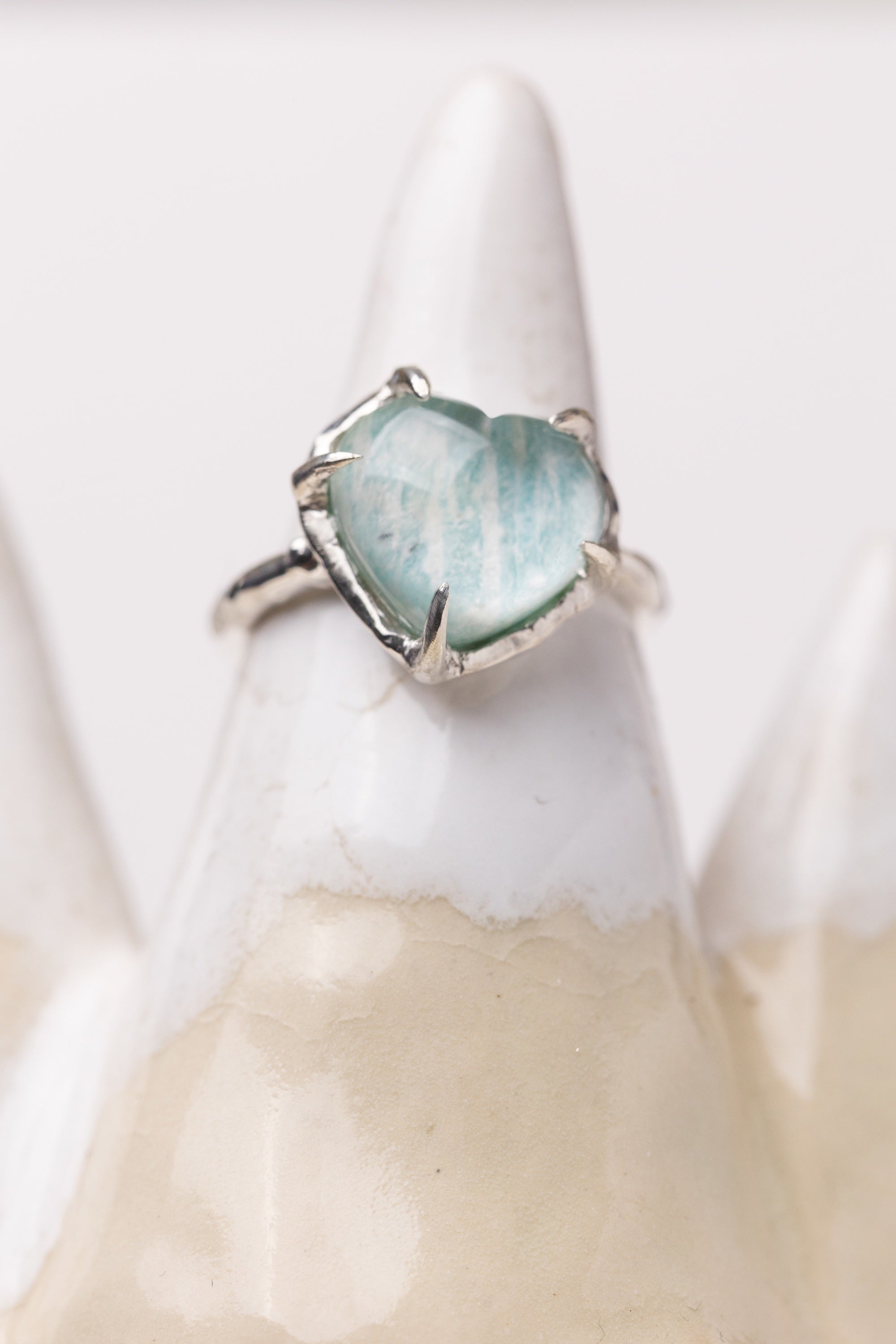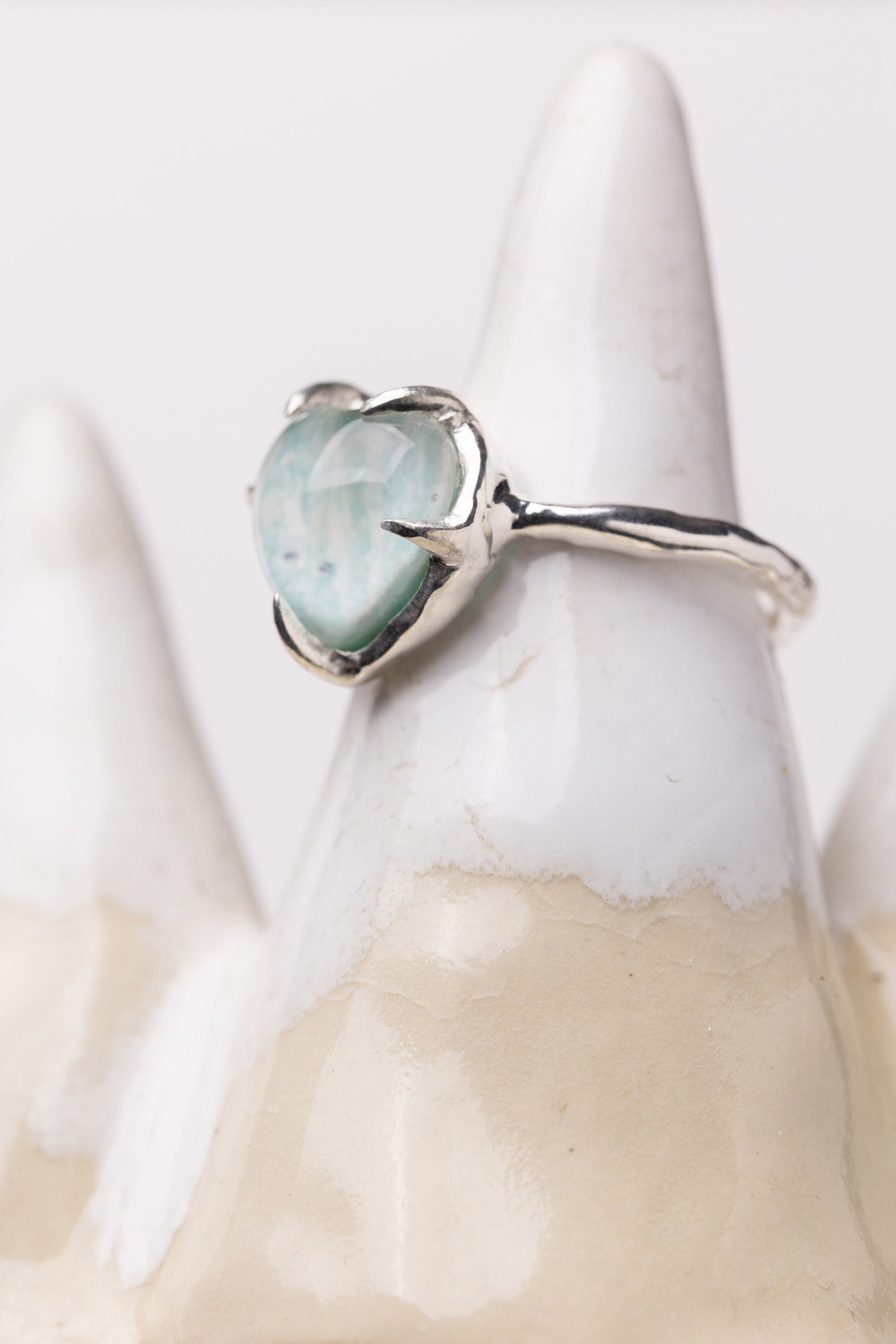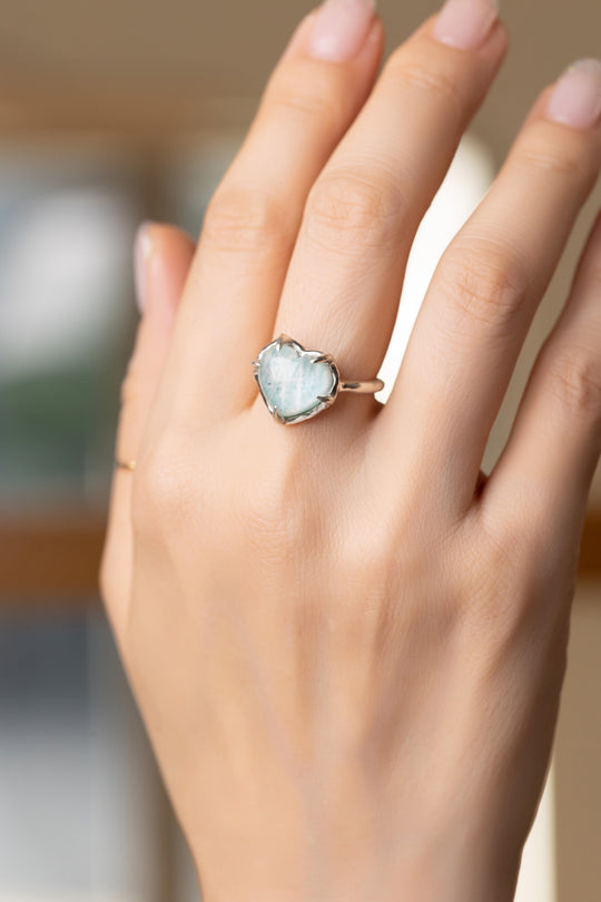 This ring feels as though it was shaped by water—softly, steadily, and with gentle conviction. The heart, domed and rounded like a drop about to fall, glows with a quietly liquid light.