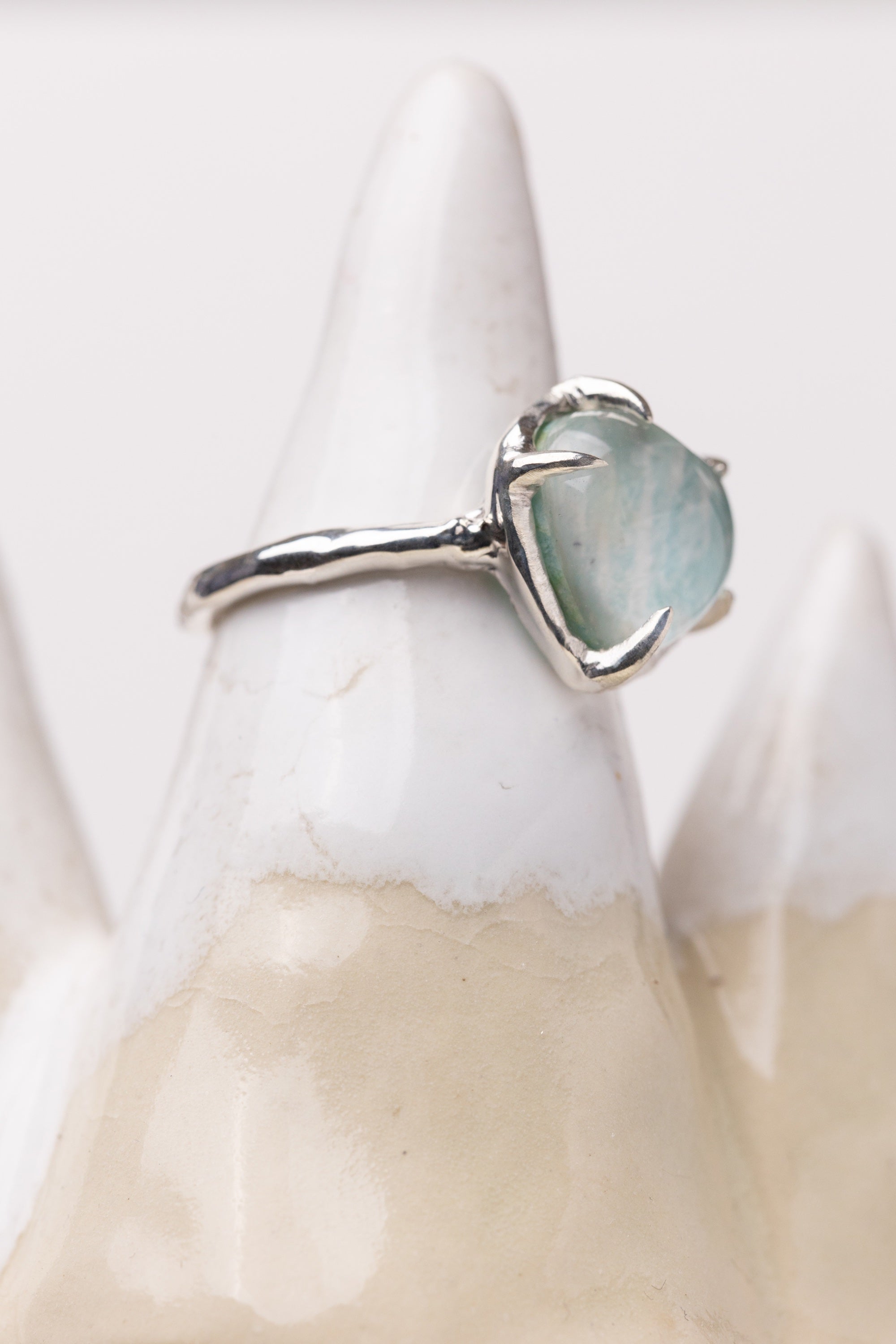 What you see is a doublet: a smooth quartz cabochon floating above Amazonite. Normally a softly matte stone, the Amazonite becomes something more under quartz—fluid, bright, alive. The natural striping within it ripples like current beneath glass, guiding the eye in a subtle, flowing motion.