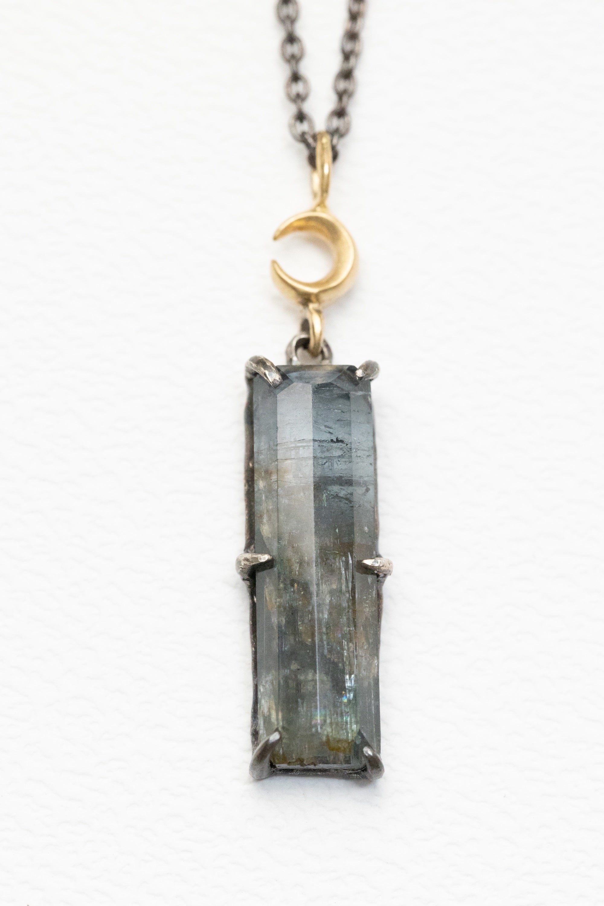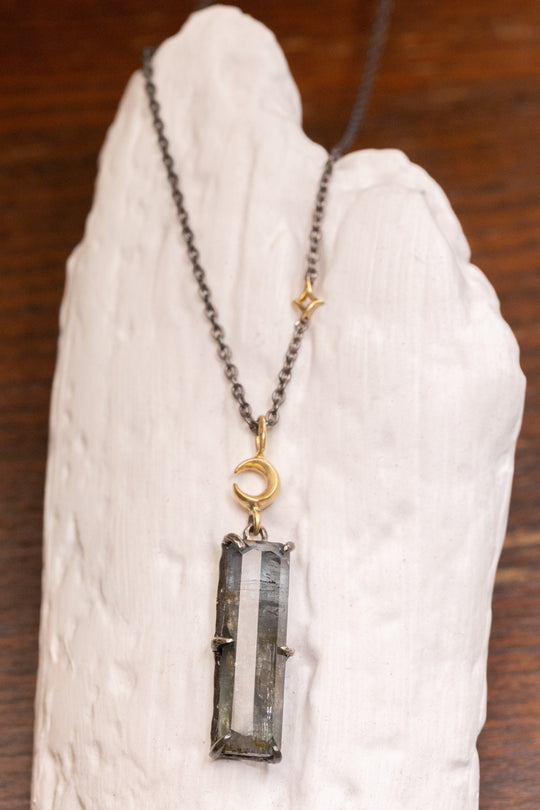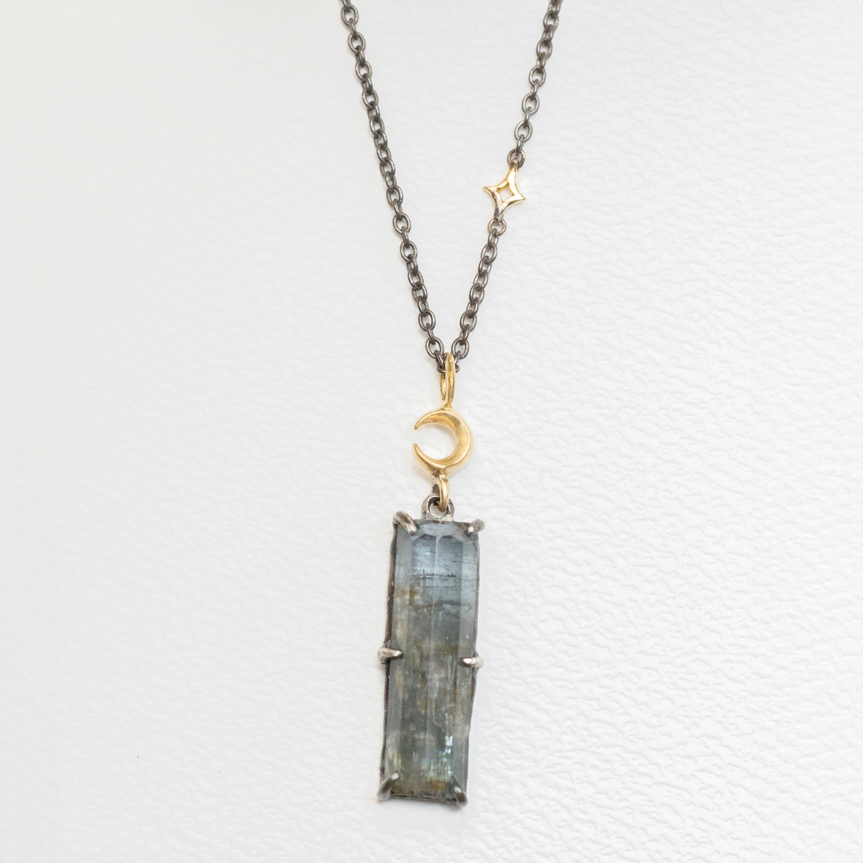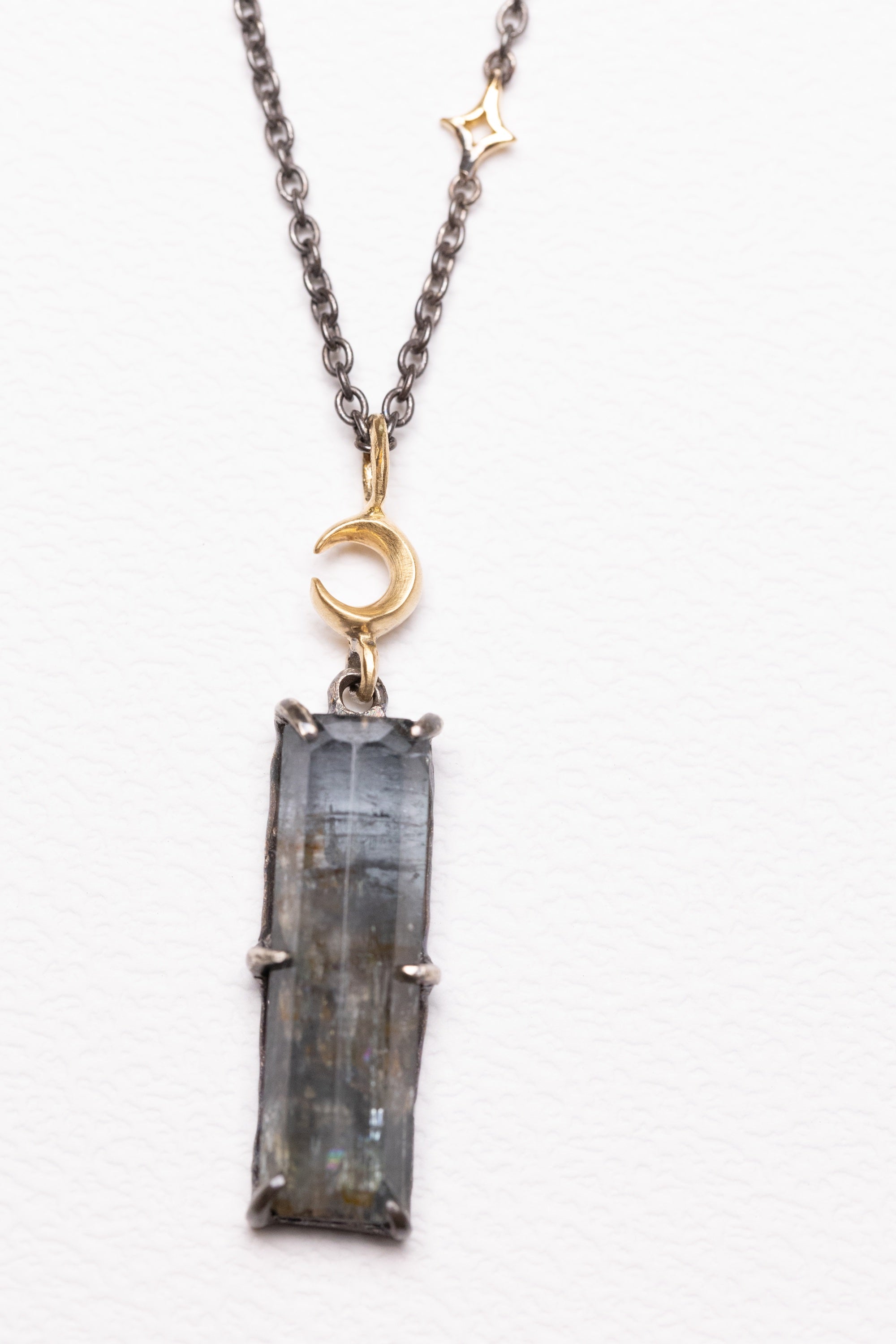 Beside the stone sits a crescent moon made in 18k gold. Along the chain, small stardust details appear like tiny points of light in a dark sky.