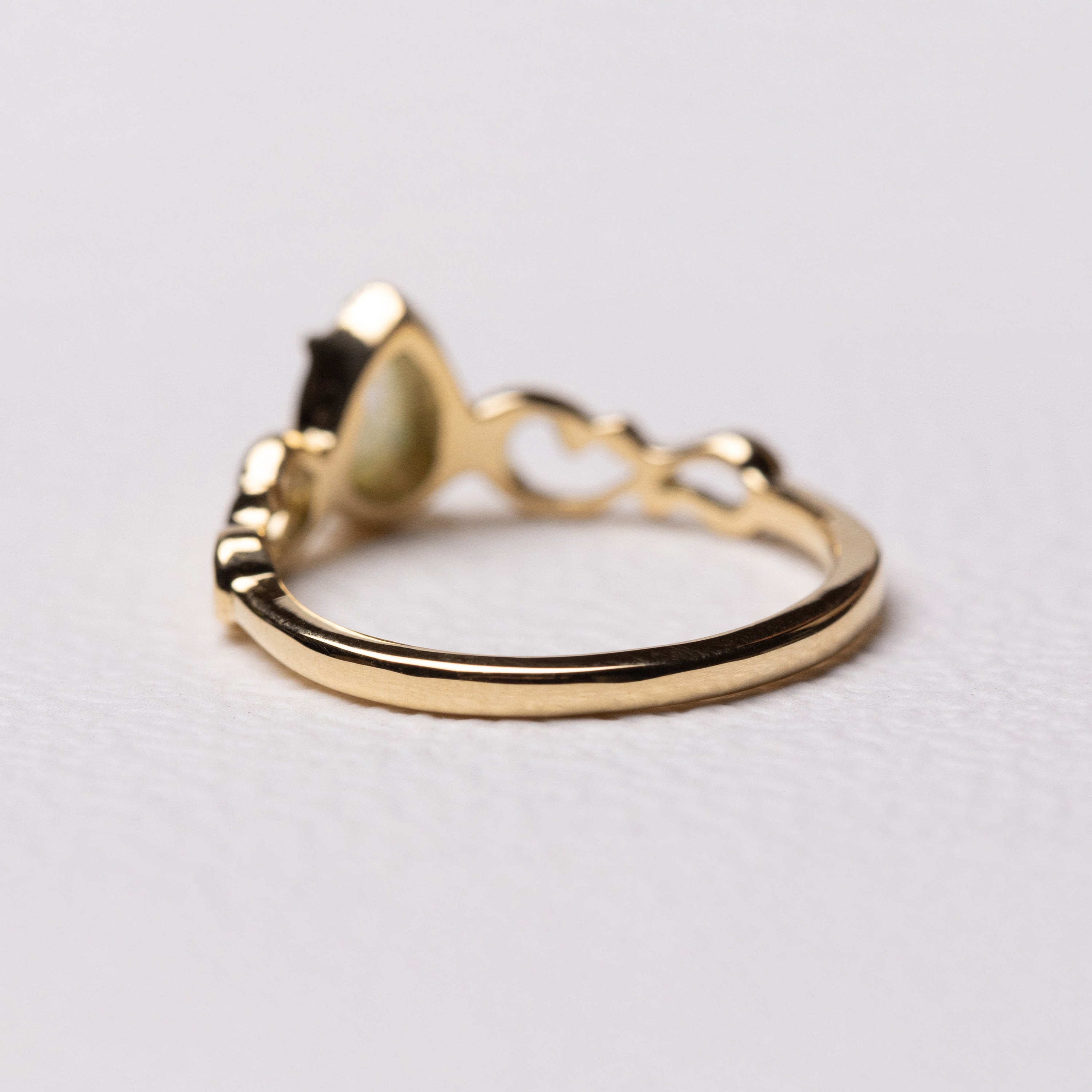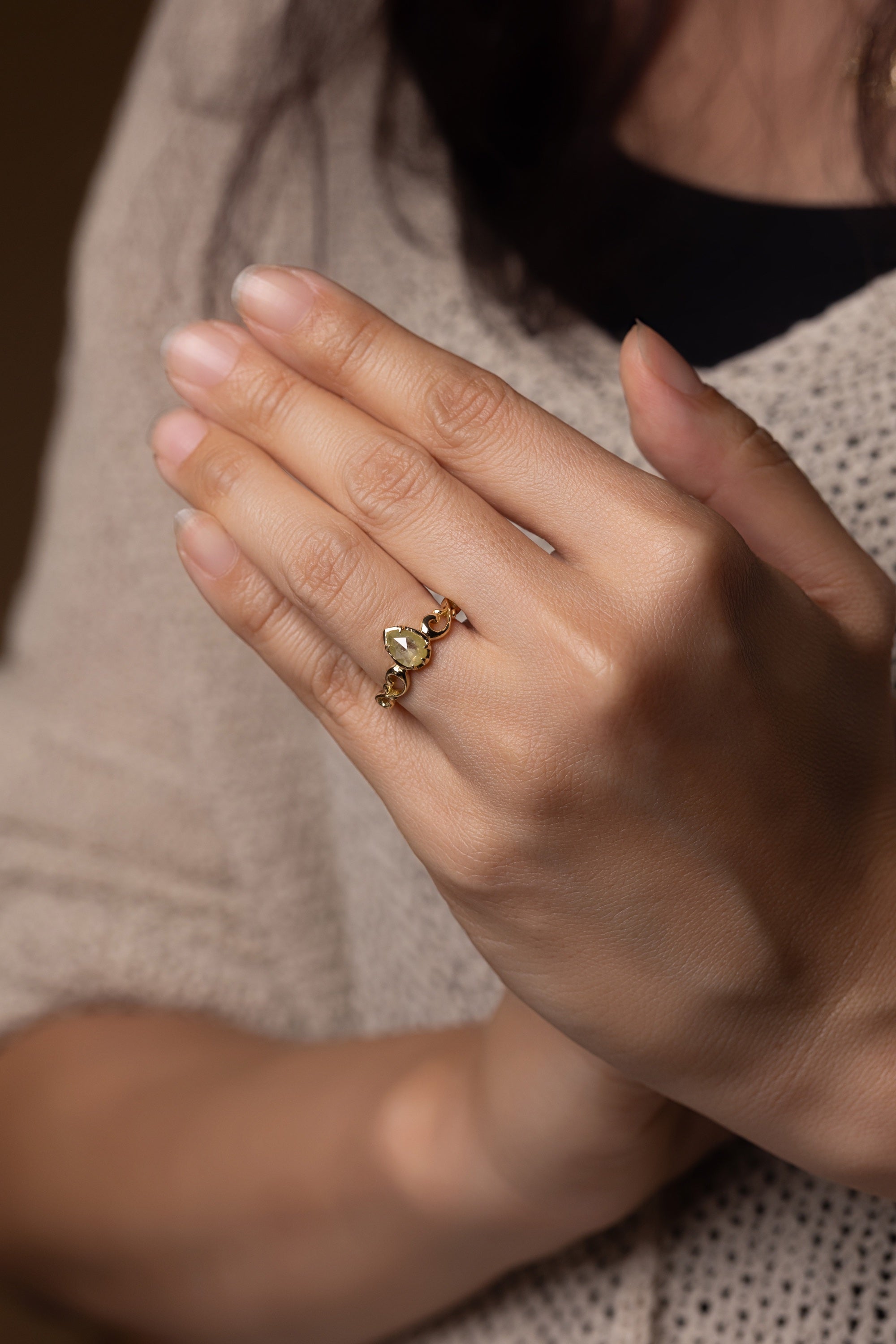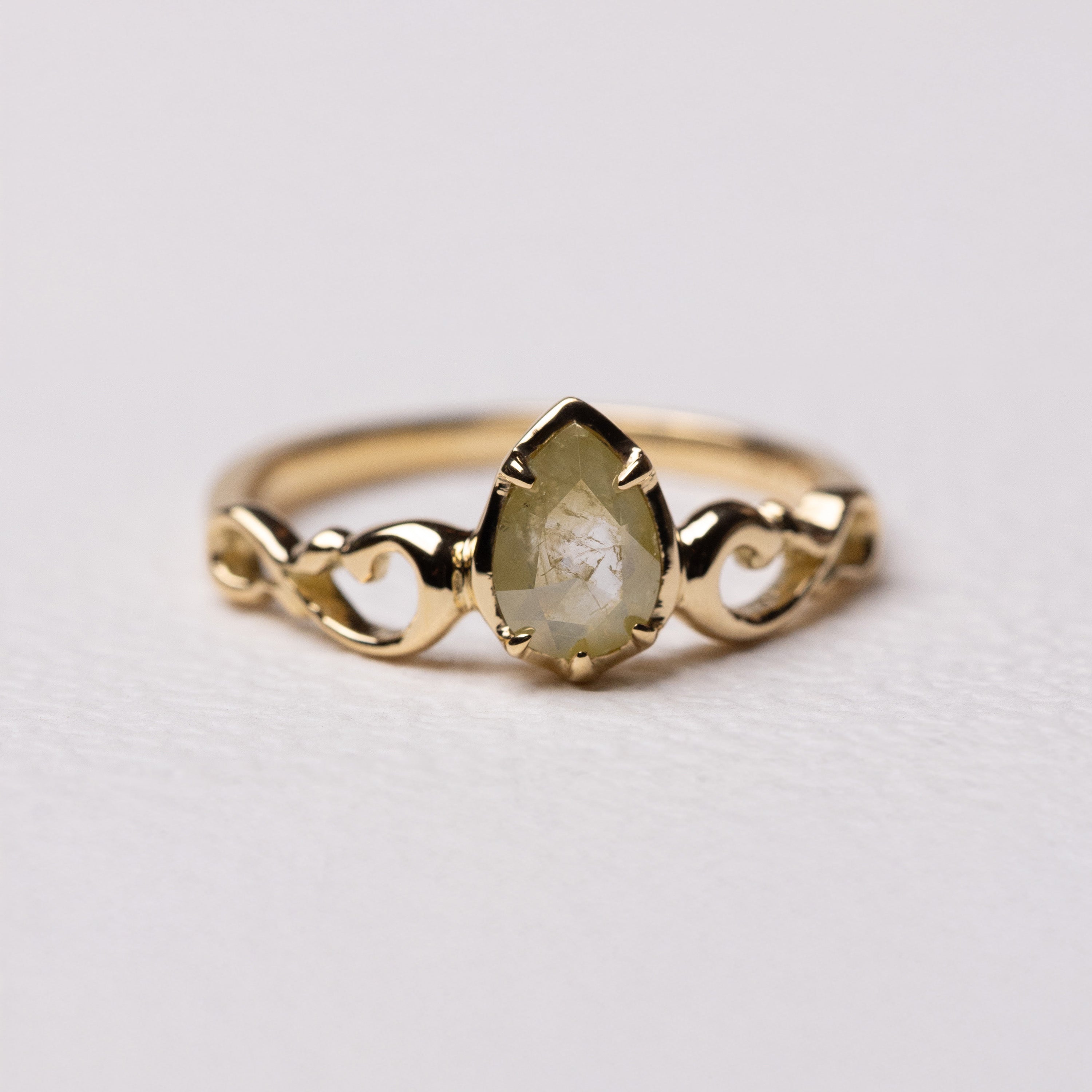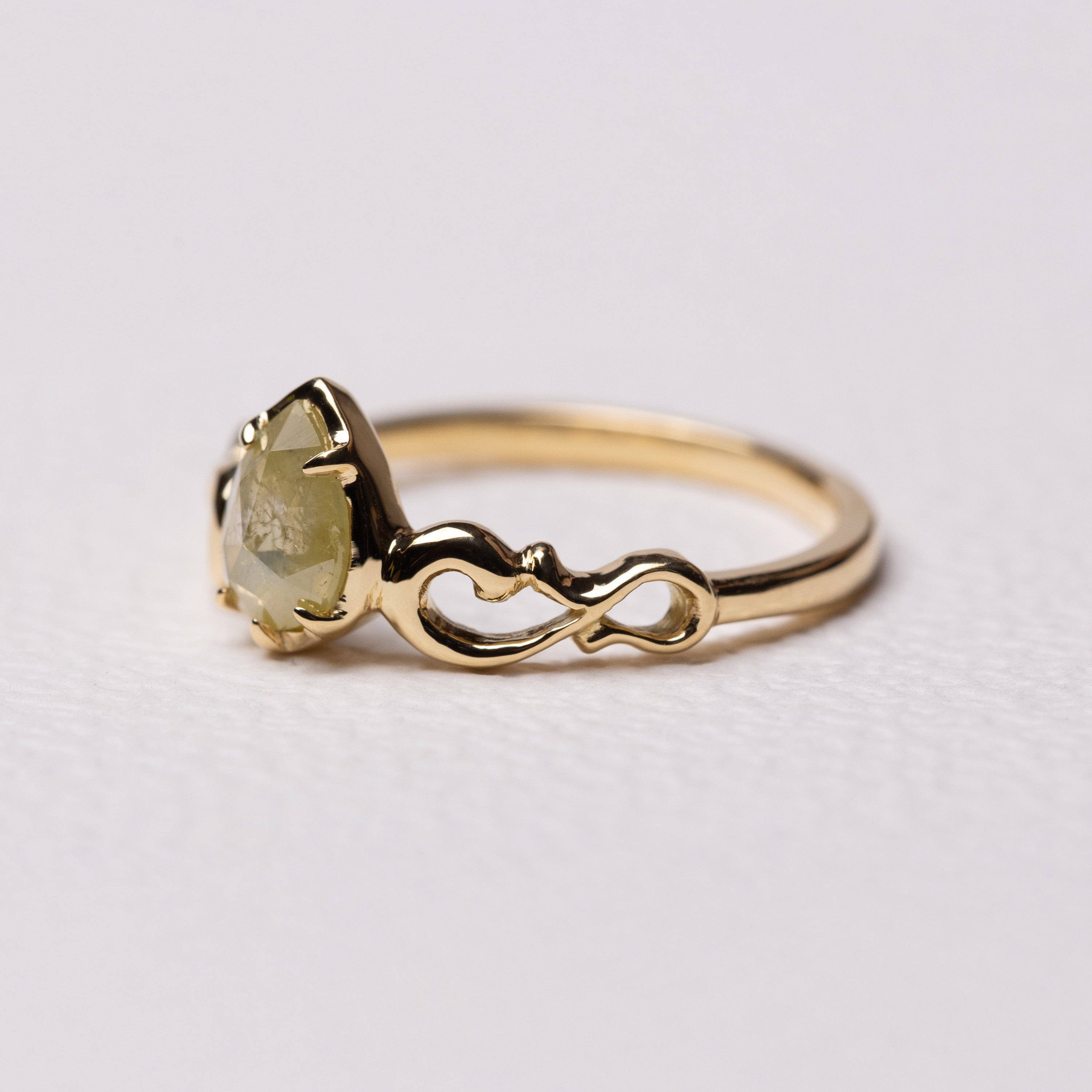This ring holds the quiet radiance of morning sunlight. A rosecut yellow diamond rests upon the graceful lace design, its gentle hue blending seamlessly with the polished gold. The result is soft, luminous, and deeply feminine.