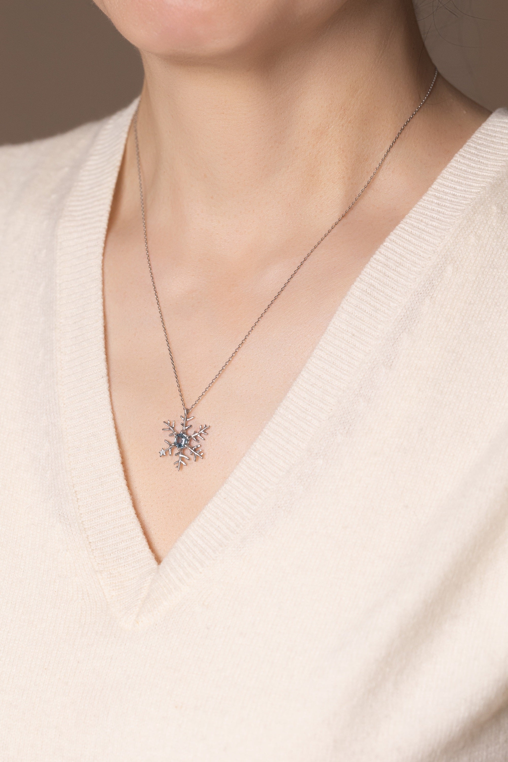 The motif is made slightly larger than others of a similar theme. When it rests at the chest, the pattern reads clearly, not as a simple ornament, but as a single snowflake gently held in place. It feels intentional and composed, never excessive.